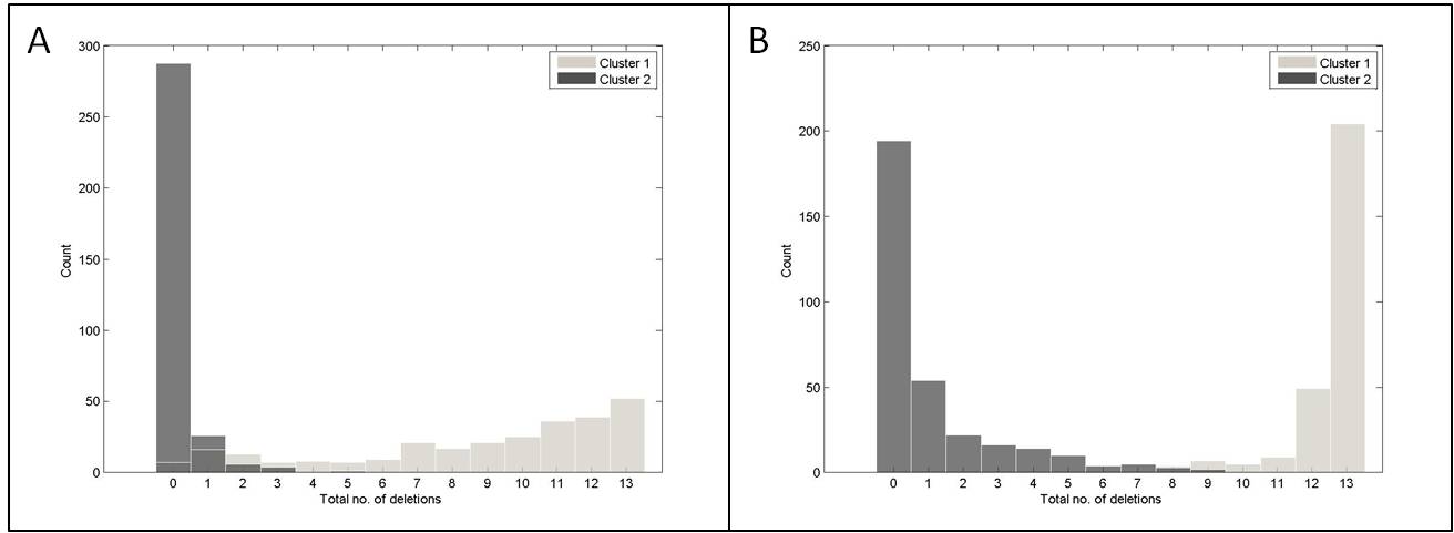 To access the data, click or select the words “Appendix 4.” Distribution of the data in total number of deletions, stratified by cluster, where a deletion has been defined as <0.65 (A) and <0.85 (B).