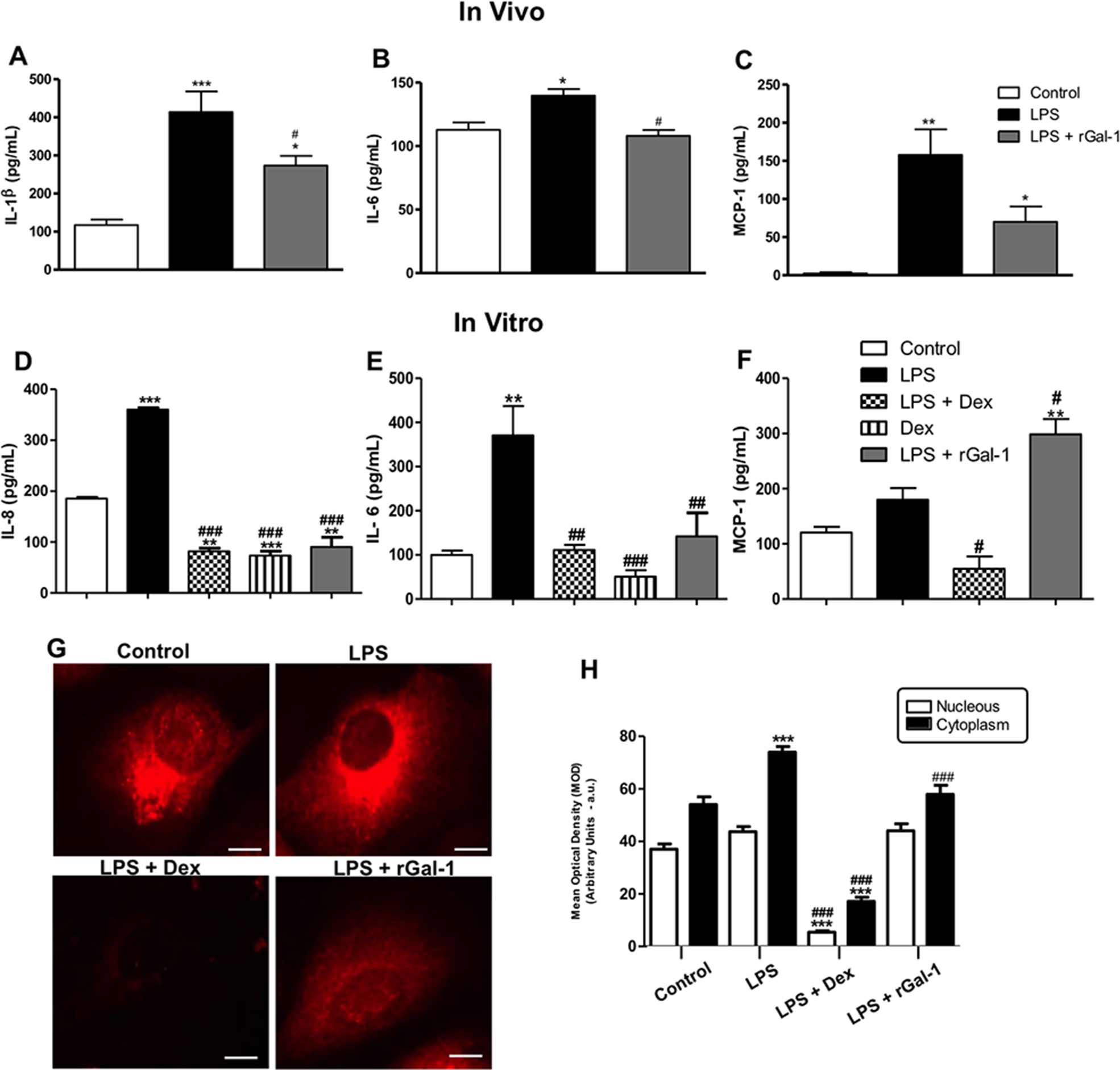 Figure 4. In vivo and in vitro administration of rGal-1 modulates proinflammatory mediators release during ocular inflammation: IL-1β (A), IL-6 (B), and MCP-1 (C) in ocular tissues (in vivo). Interleukin-8 (IL-8) (D), IL-6 (E), and monocyte chemotactic protein-1 (MCP-1; F) in ARPE-19 cells (in vitro). Data are expressed as the mean ± SEM (pg/ml) from the eye homogenates (n = 5) or cell supernatants.