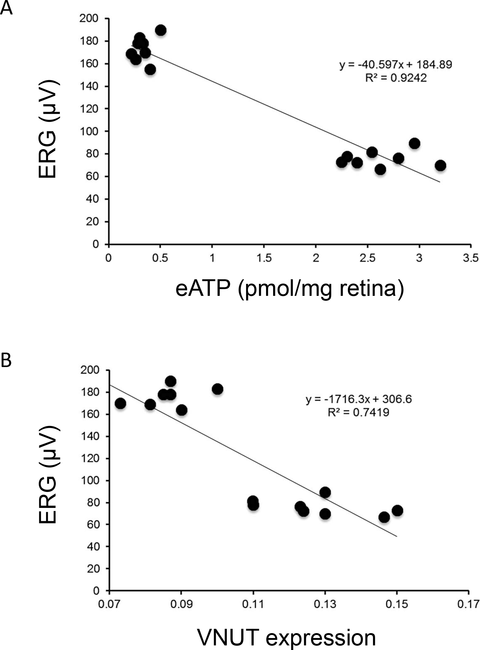 Figure 3. Correlation between electroretinogram recordings, ATP and vesicular nucleotide transporter expression. Relationship between