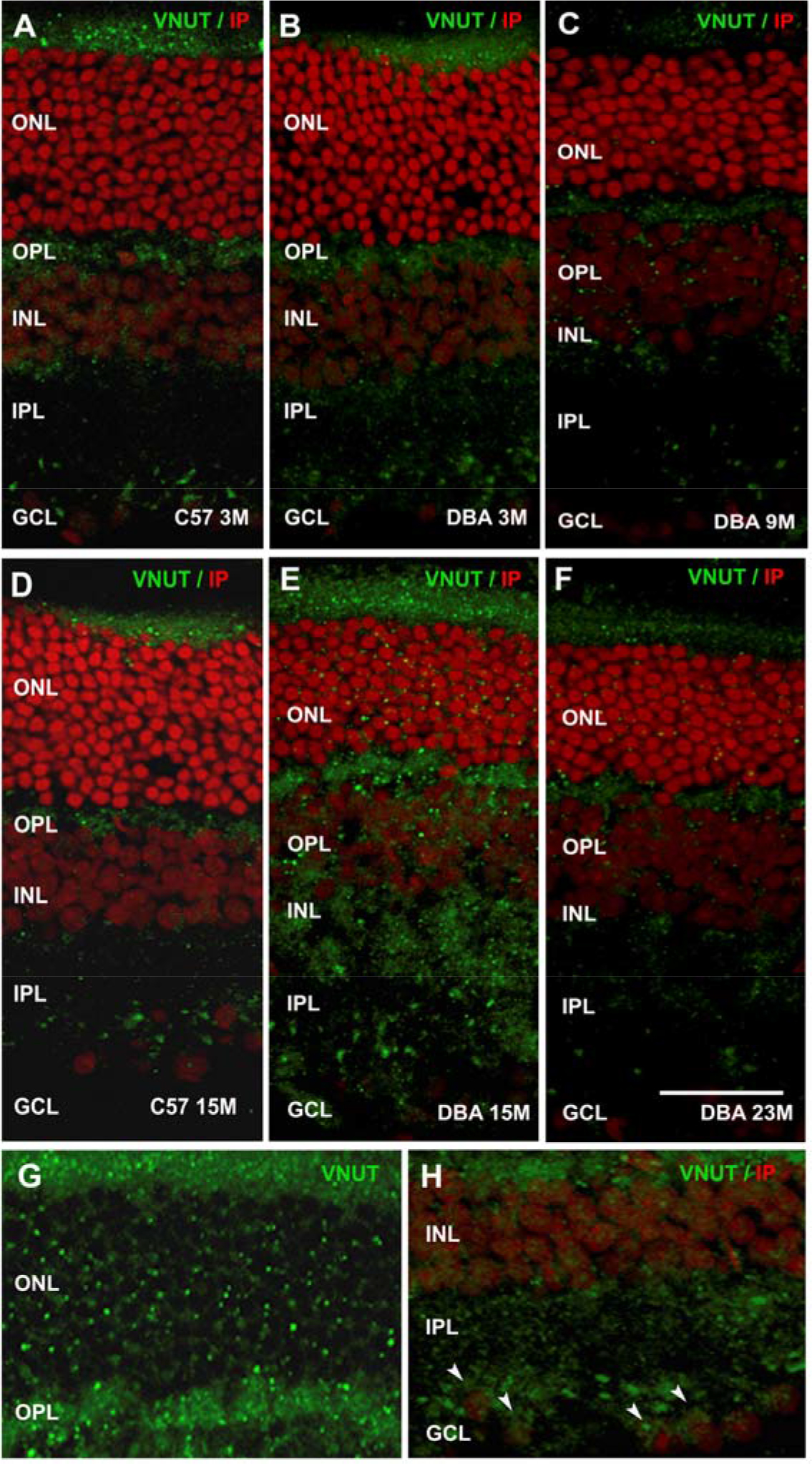 mice (E) compared to that observed in the DBA/2J and C57BL/6J mice at 3 months (A, B) and 23 months (F). G–H: High magnification of the photoreceptor layer, showing an increase in VNUT labeling in the DBA/2J mice at 15 months (G) and VNUT staining found in ganglion cells (arrows; H). Nuclei were stained with propidium iodide (red). All images were collected from the central area of the retina. ONL, outer