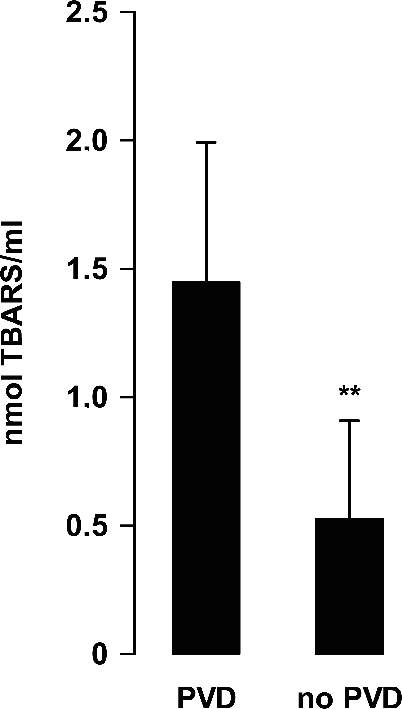 Figure 1. TBARS levels in terms of the biomicroscopic detection of a PVD. Patients with an evident posterior vitreous detachment (PVD)