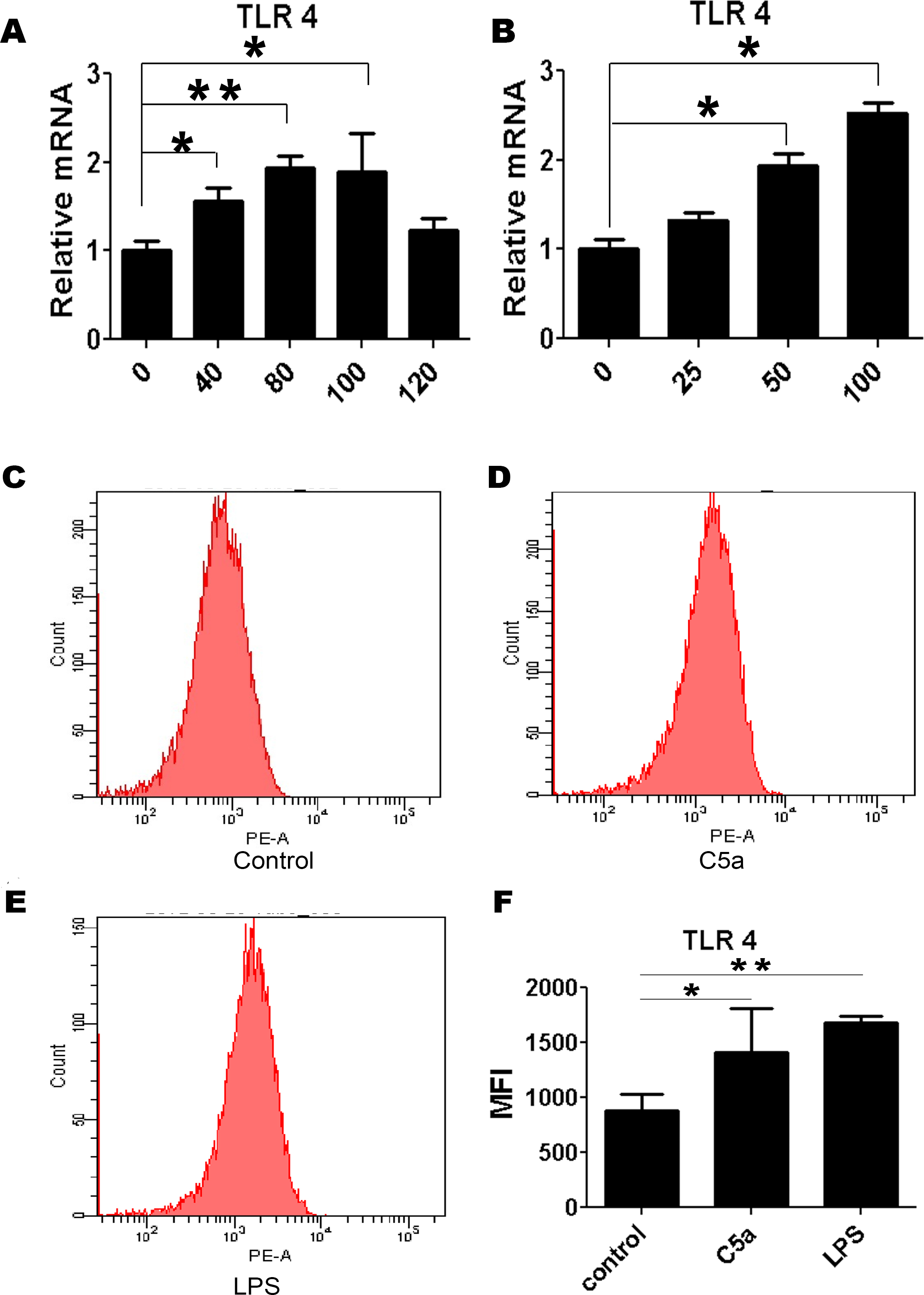 or they were stimulated with different concentrations of C5a (25, 50, and 100 ng/ml) for 80 min. C, D, E, and F: Flow cytometric analysis of the TLR4 protein expression. Cells were stimulated with C5a (50 ng/ml) or LPS (100 ng/ml) for