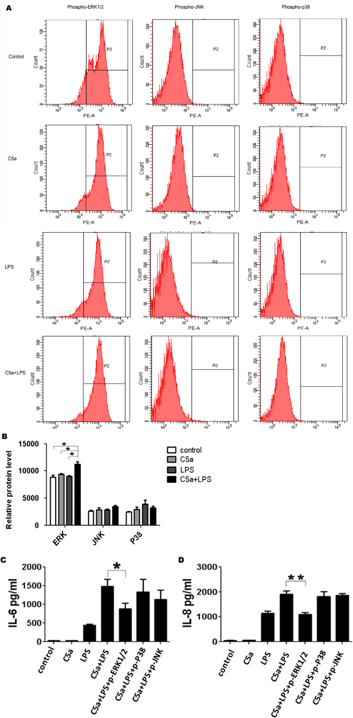 LPS (100 ng/ml) in the absence or presence of C5a (50 ng/ml) for 30 min. A: Representative histograms for the phosphorylation of MAPK are shown at 30 min. B: The MFI of phosphor-ERK1/2, JNK, and P38. C5a was added to the culture 10 min before LPS challenge. Inhibitors of JNK (SP