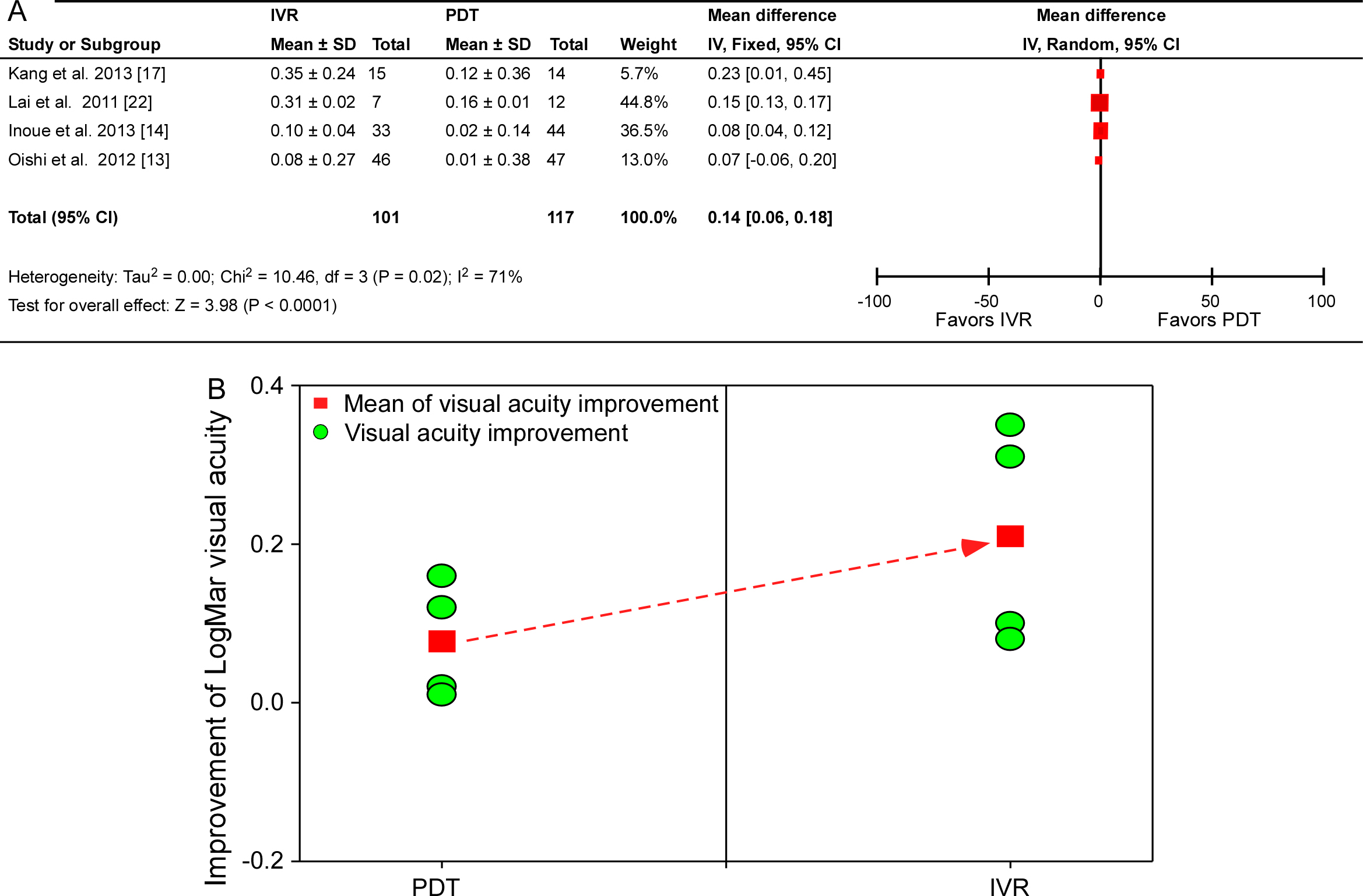 Figure 4. Four studies evaluated the visual acuity in a 24-month follow-up after the treatments. A: A meta-analysis indicates that IVR improved LogMar visual acuity compared to PDT 24 months after the treatments in patients