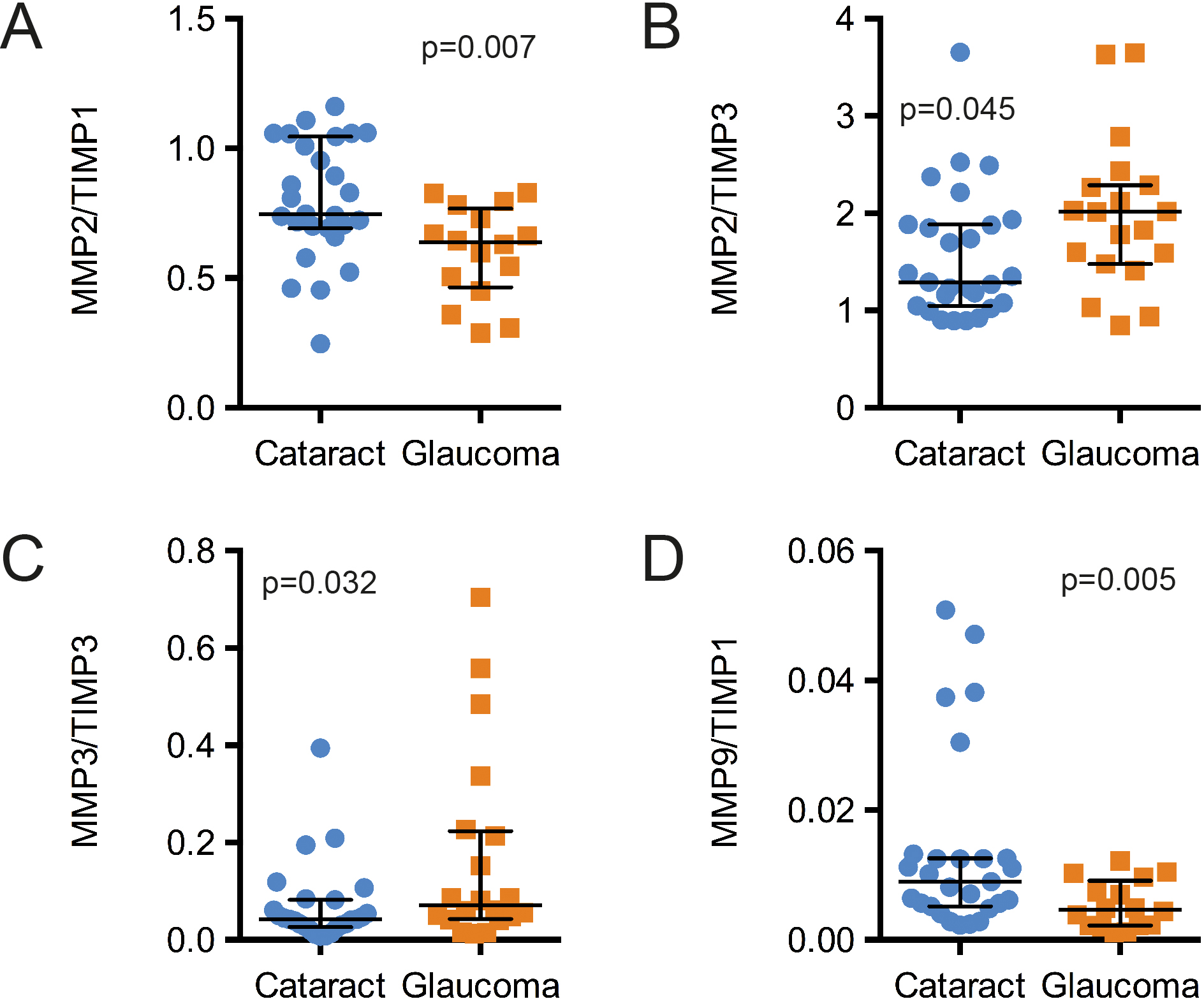 Figure 2. Distribution of MMP/TIMP ratios in cataract versus POAG patients. Stoichiometric ratios were calculated for individual aqueous