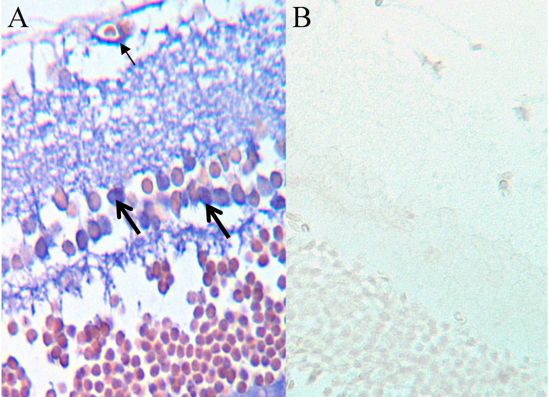 Panel A shows localization of miR-155 (blue chromogen) in the retinal capillaries (small arrow) and in the cells of inner nuclear layer (large arrow), probably in the retinal glial and neuronal cells. Panel B shows the scrambled control retina. To access the data, click or select the words “Appendix 3.”