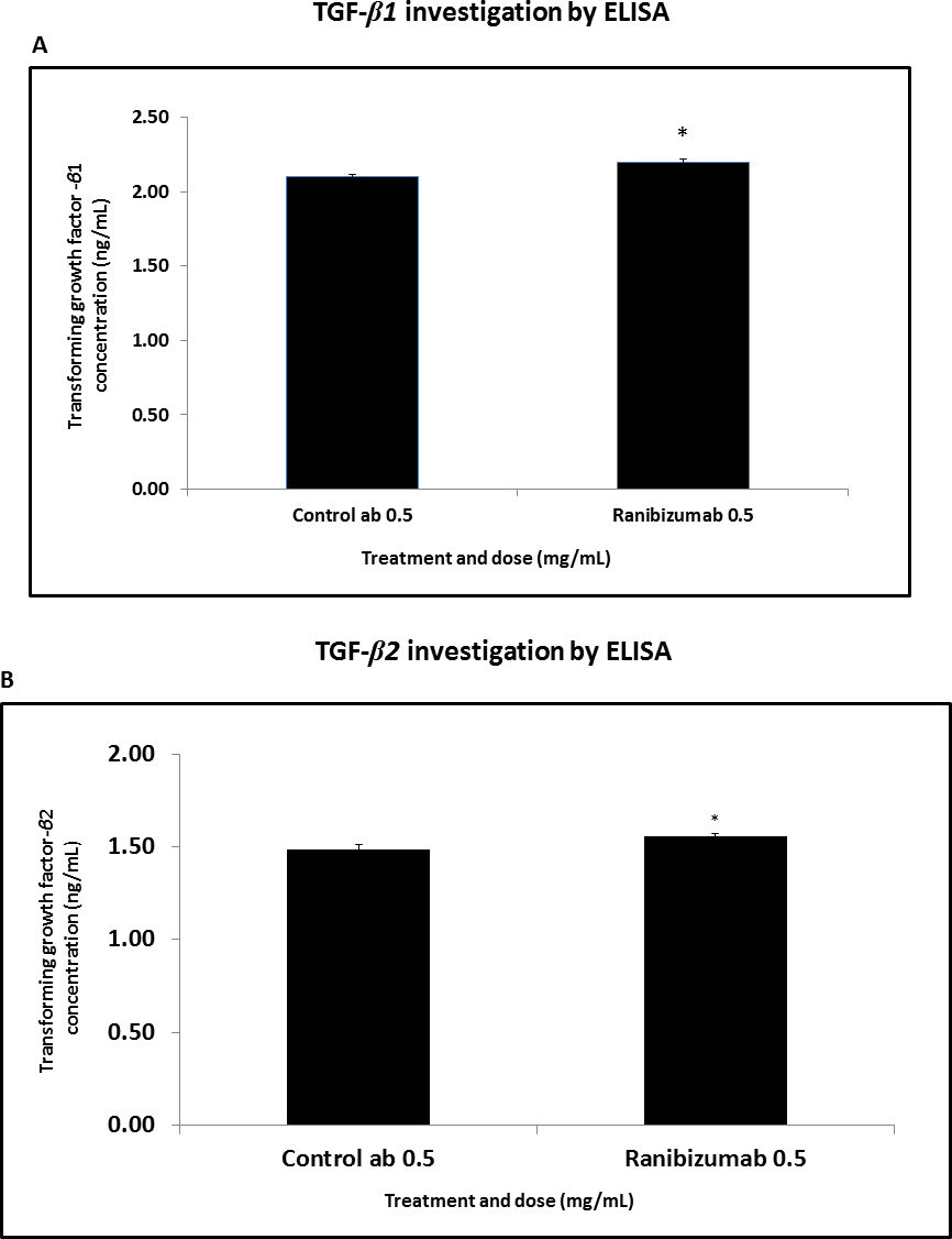 Figure 5. TGF-β1 and TGF-β2 protein evaluated with ELISA (continuous 48 h) in serum-free condition. A: Human Tenon’s fibroblasts (HTFs) treated with the 0.5 mg/ml ranibizumab concentration demonstrated significant increase