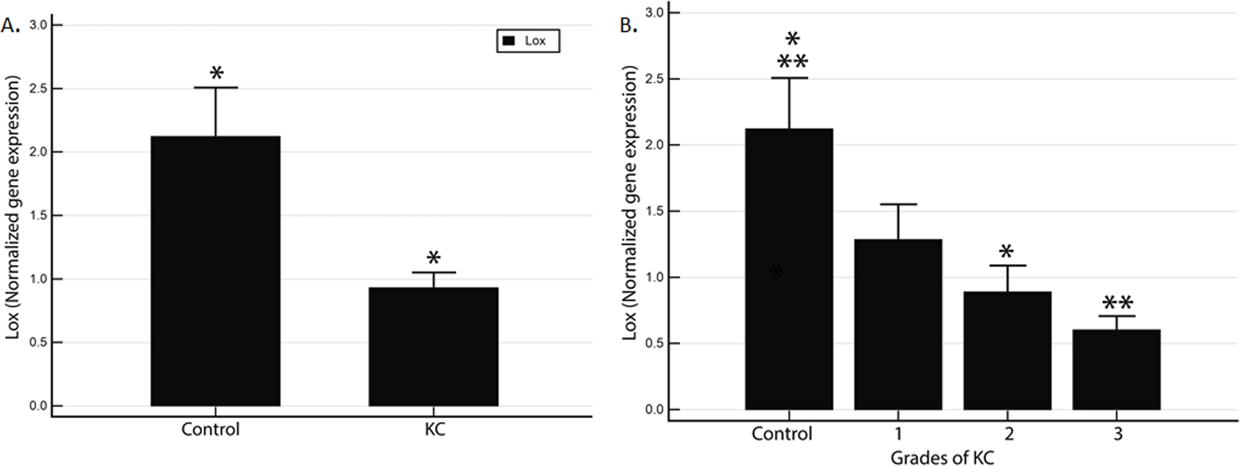 corneal epithelial cells from 52 control and 90 KC samples. Relative LOX gene expression in (A) control versus KC epithelium; (B) patients stratified by clinical grades of KC (Grade 0 = control).
