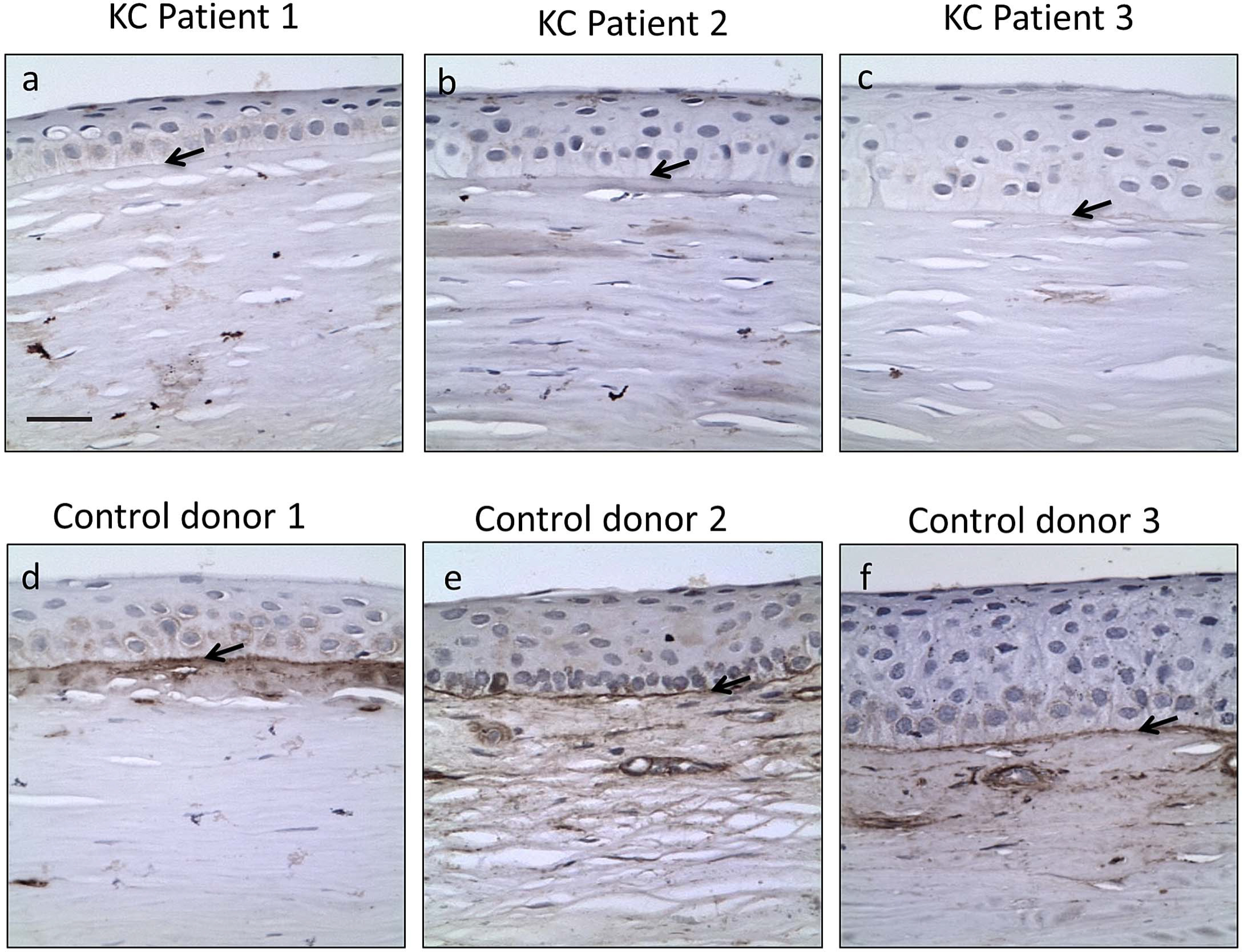 sub-epithelium, as indicated by the arrows. Three independent representative samples for KC and control corneas are presented