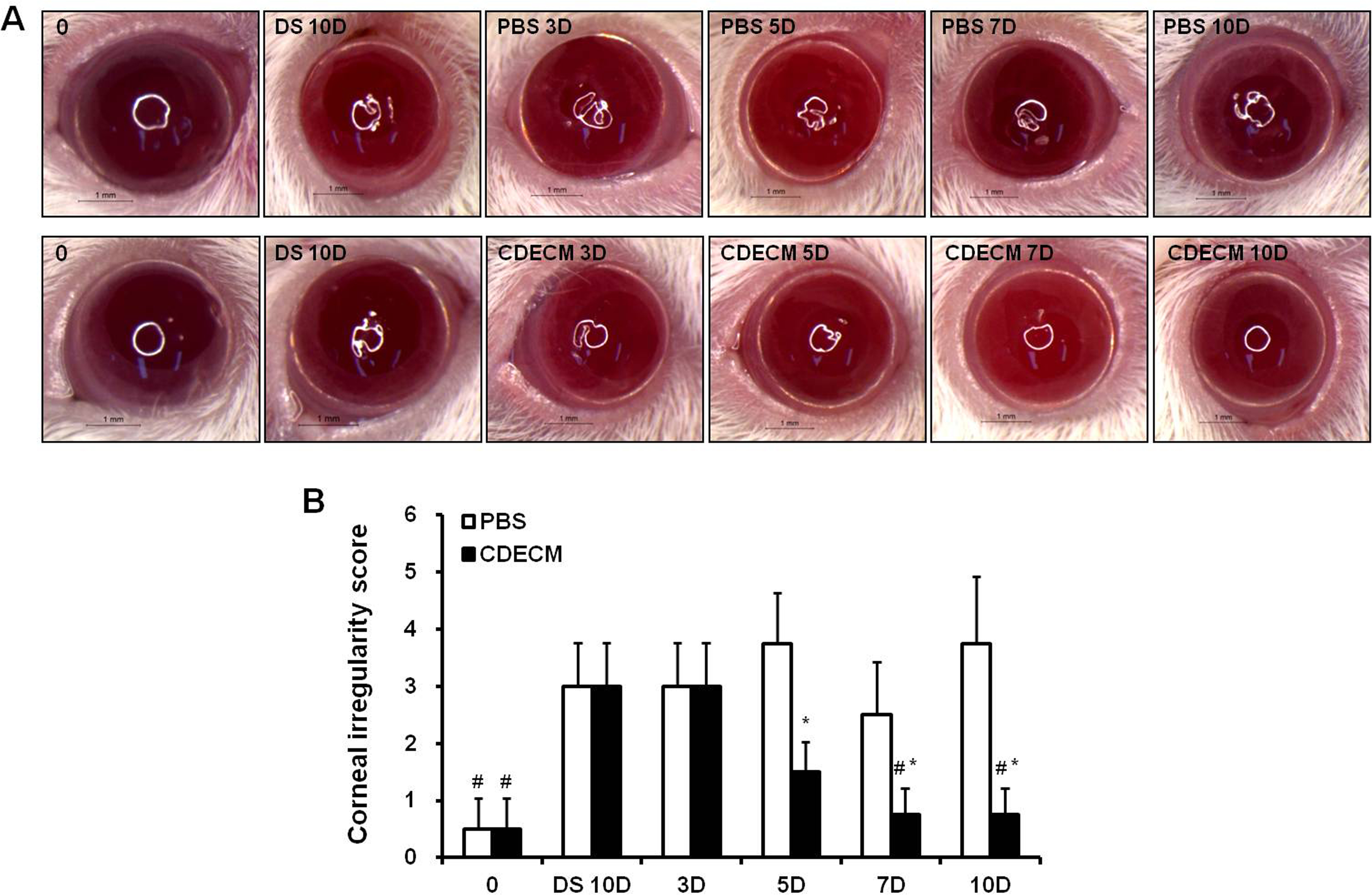 Figure 2. Effects of CDECM on the corneal surface irregularities. A: The eyes of the PBS and chondrocyte-derived extracellular matrix (CDECM) groups were imaged using a microscope after the