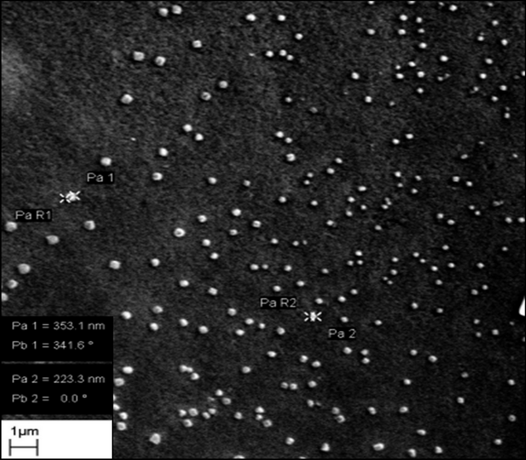 0.005% v/v lutein aqueous solution. The particles show a spherical shape with uniform particle size distribution. Images for