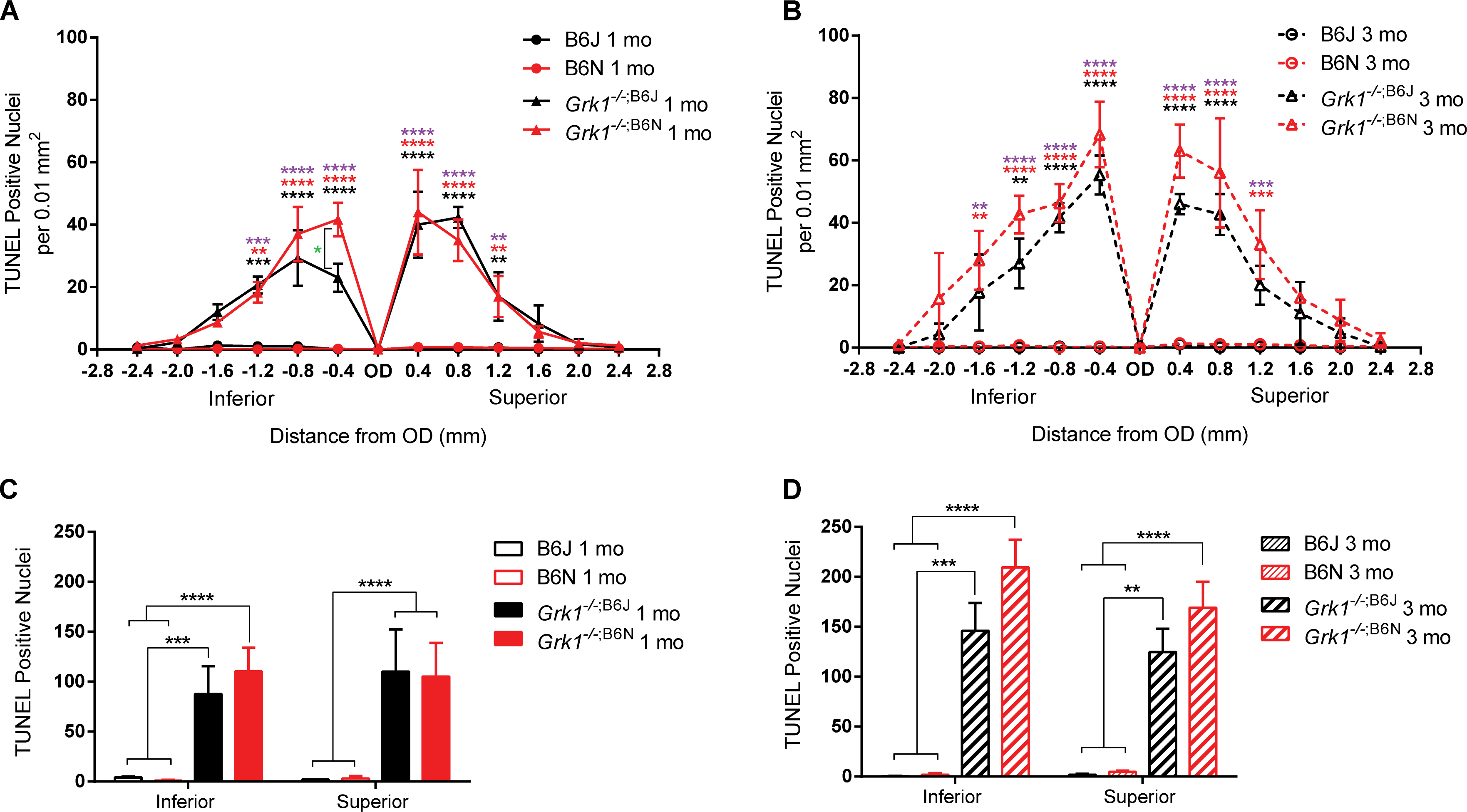asterisk shows Grk1−/−;B6N significance compared to that of B6N. The level of significance of the Grk1−/−;B6J retinas compared to the B6N retinas is identical in comparison to the B6J retinas (A). Grk1−/−;B6N TUNEL is significantly increased against Grk1−/−;B6J at one point in the inferior retina (A, −0.4 mm, green asterisk). C and D are total TUNEL-positive counts in the inferior and superior retina at (C) 1 and (D) 3 months. The Grk1−/−;B6J and Grk1−/−;B6N retinas are significantly increased compared to the B6J and B6N retinas (*p<0.05, **p<0.01, ***p<0.001, ****p<0.0001). OD=optic