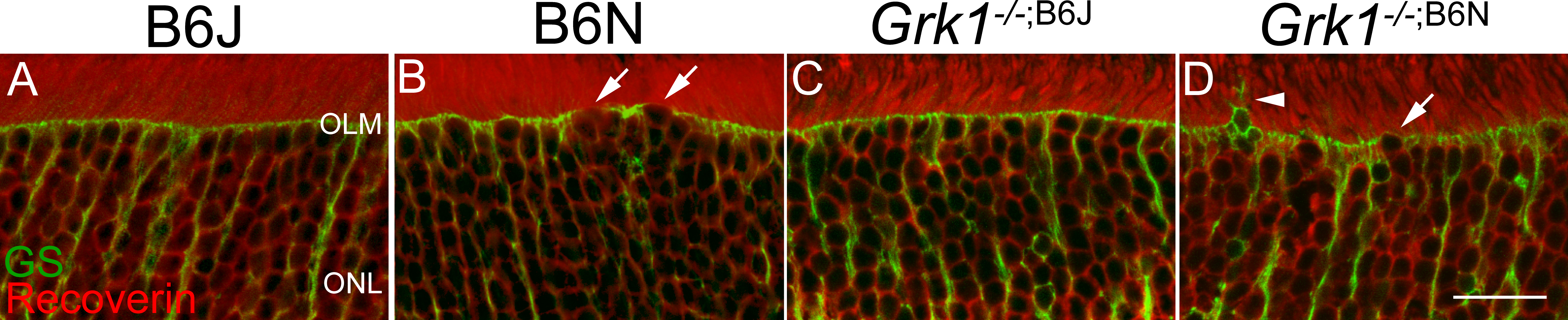 for immunohistochemical staining. A and B: Photoreceptors (red) are healthy and organized in the B6J and B6N retinas. C and D: Photoreceptors show disorganization and gaps between the outer segments in the Grk1−/−;B6J and Grk1−/−;B6N retinas. A and C: The OLM (green) is intact in the B6J and Grk1−/−;B6J retinas. B and D: The OLM disruption is apparent in GS staining in the B6N and Grk1−/−;B6N retinas (arrows). Nuclei and Müller cell projections extend toward the sub-retinal space where the OLM is disrupted (D, arrowhead). Images were taken at 2X zoom on a 40X objective lens (scale bar, 20 µm). NFL=nerve fiber layer; OLM=outer limiting
