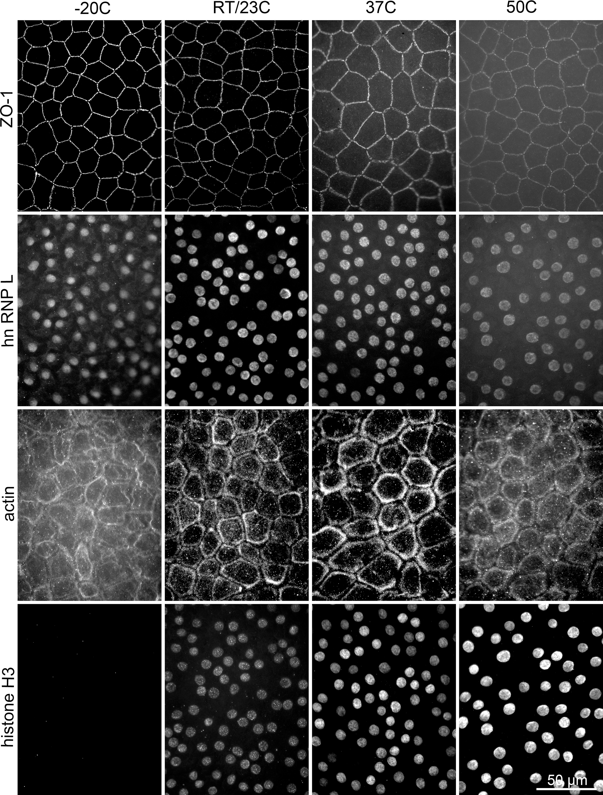 Influence of temperature during methanol fixation. All corneal pieces were fixed for 30 min. No pseudocolor for immunostaining; no counterstaining for nuclei. 40X objective.