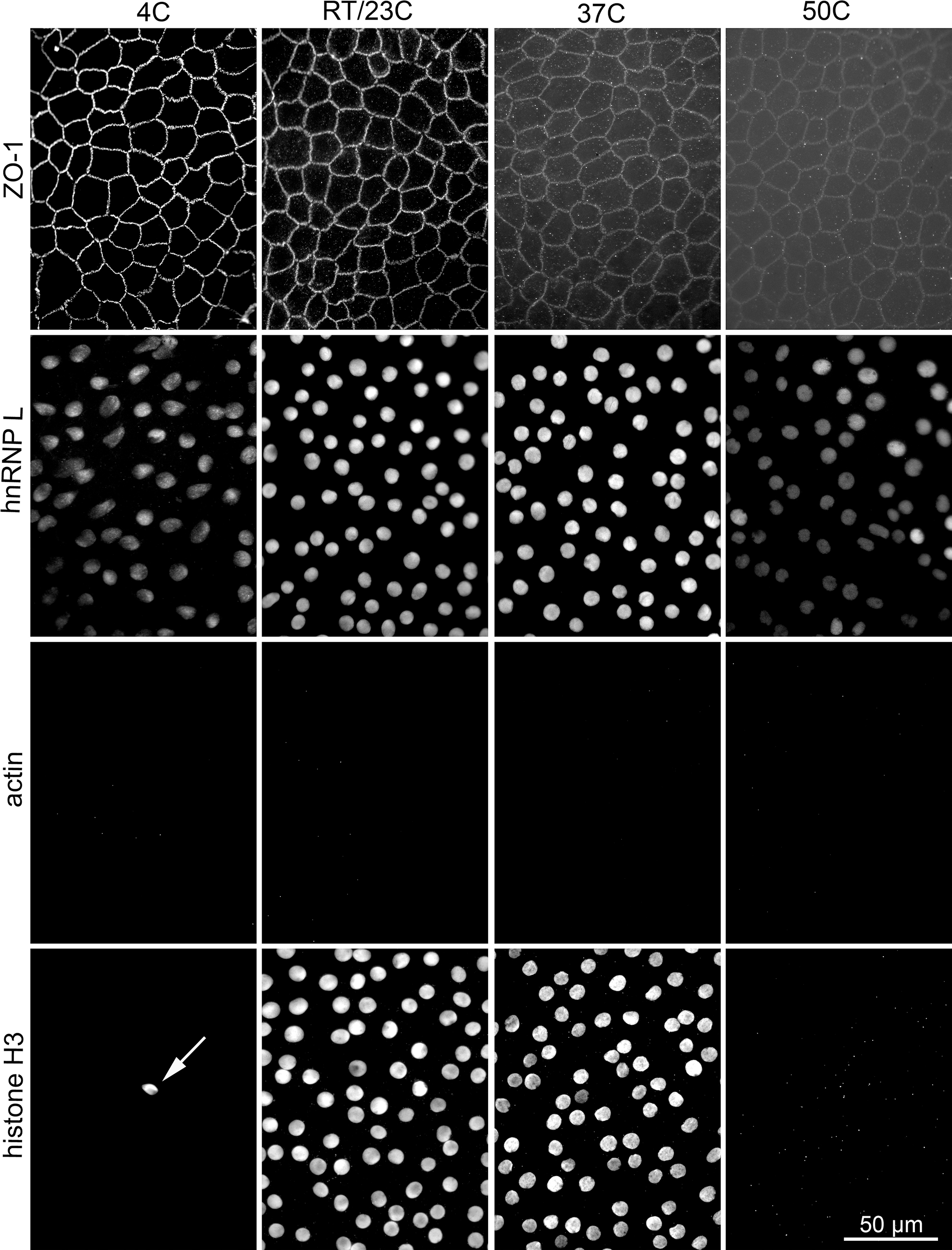 membrane after fixation at 4 °C; the arrow indicates the single cell that remained attached. No pseudocolor for immunostaining;
