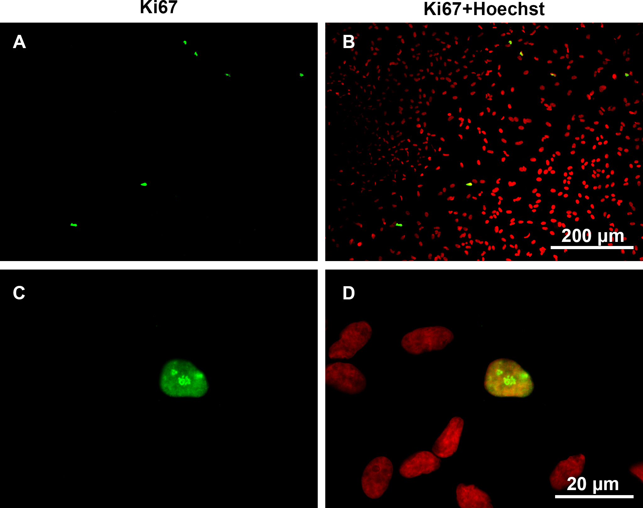 corneal dystrophy. A, B: Low magnification (10X objective) shows a few Ki67 positive cells scattered at random. Note that the nuclei morphology and