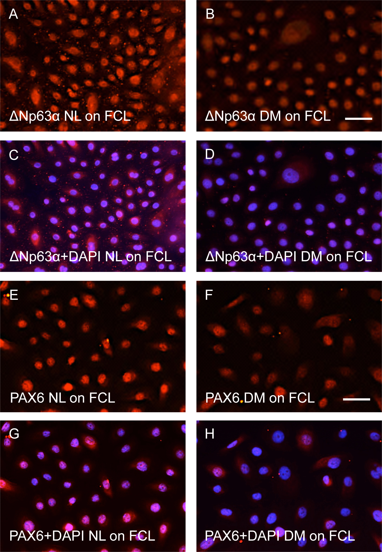 Figure 3. Expression of ΔNp63α and PAX6. Both markers are mainly localized in the nuclei of limbal epithelial cells (LECs) cultured