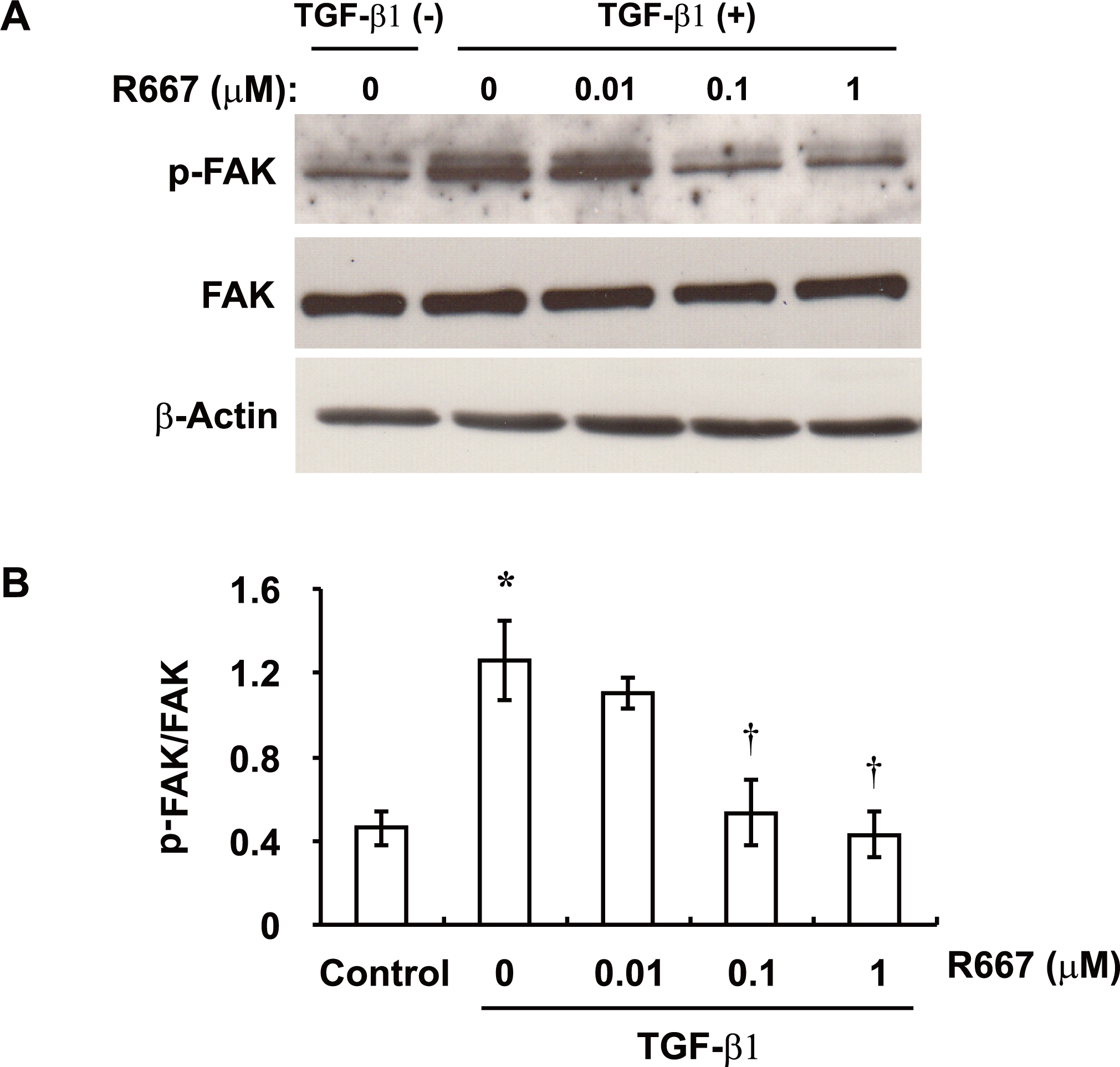 Figure 4. Inhibitory effect of R667 on the TGF-β1-induced phosphorylation of FAK in HTFs cultured in collagen gels. A: Cells embedded in collagen gels were incubated first for 12 h with various concentrations of R667 and then for 3 days in