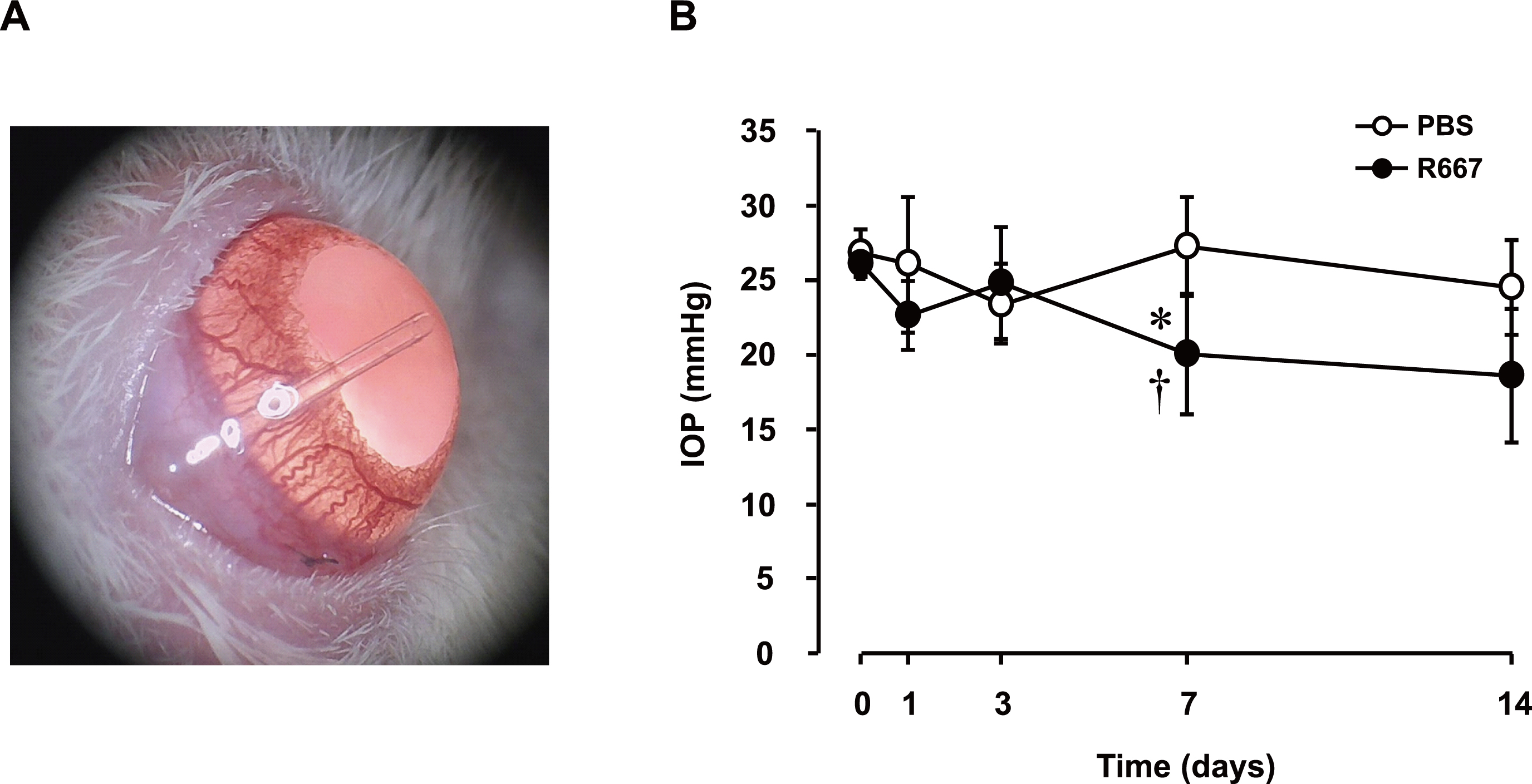 Figure 7. Effect of R667 on IOP in rats after glaucoma filtration surgery. A: Representative photograph of the left eye at 14 days after surgery. B: Intraocular pressure (IOP) of the left eye at the indicated times after filtration surgery for rats treated with R667 or