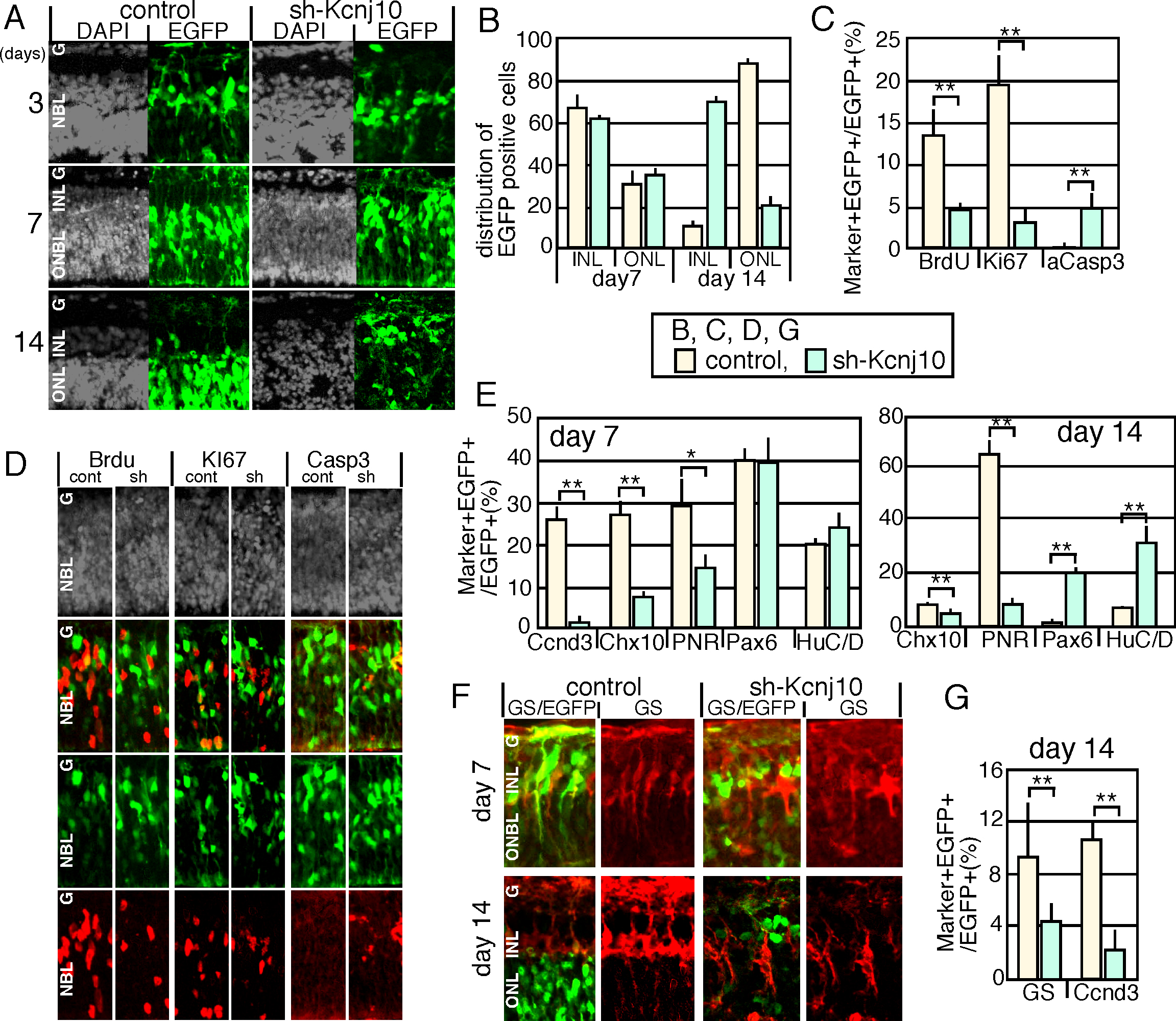 marker and EGFP double-positive cells in the total EGFP positive cells (E, G). The number of marker-positive cells in each layer was counted in 150-μm-wide retina (F). Staining patterns of GS and EGFP (H) are shown. Nuclei were visualized with 4',6-diamidino-2-phenylindole (DAPI) staining (gray) in A, D. P value; * <0.05, **<0.01 (the Student t test from at least three independent samples). cont, control; sh, sh-Kcnj10; ONL, outer nuclear layer; INL, inner nuclear