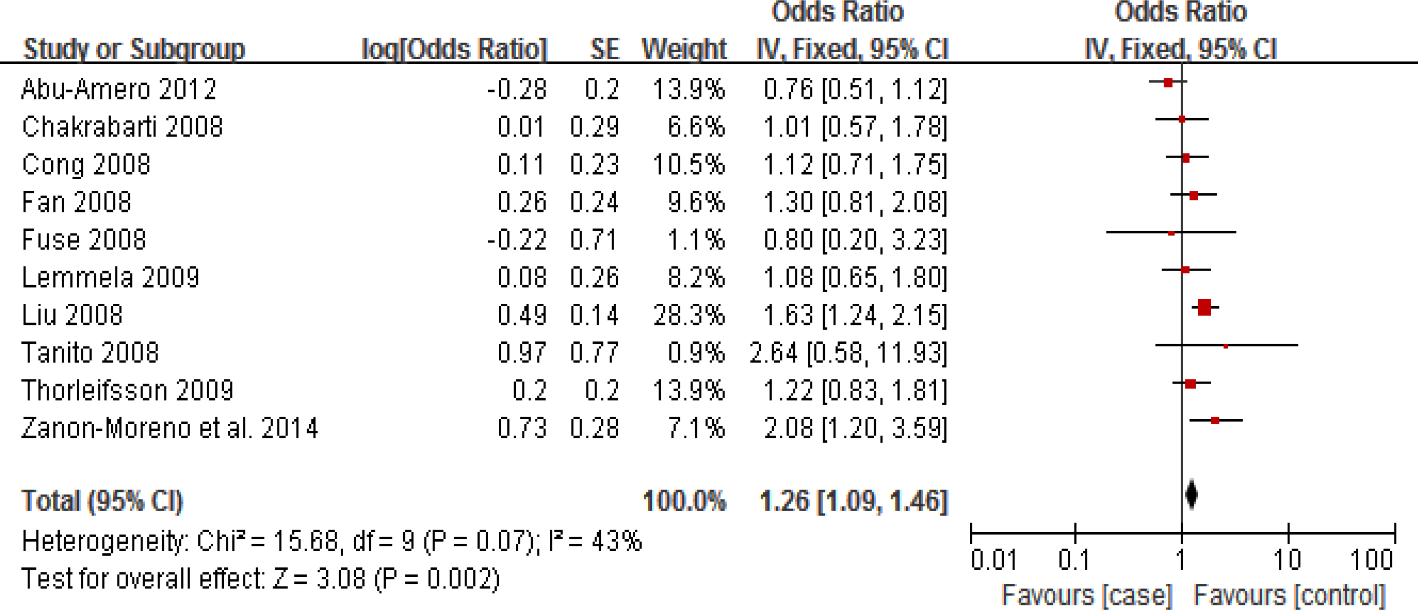 rs2165241 in the total population; the horizontal lines correspond to the study-specific OR and 95% CI, respectively. The area of the