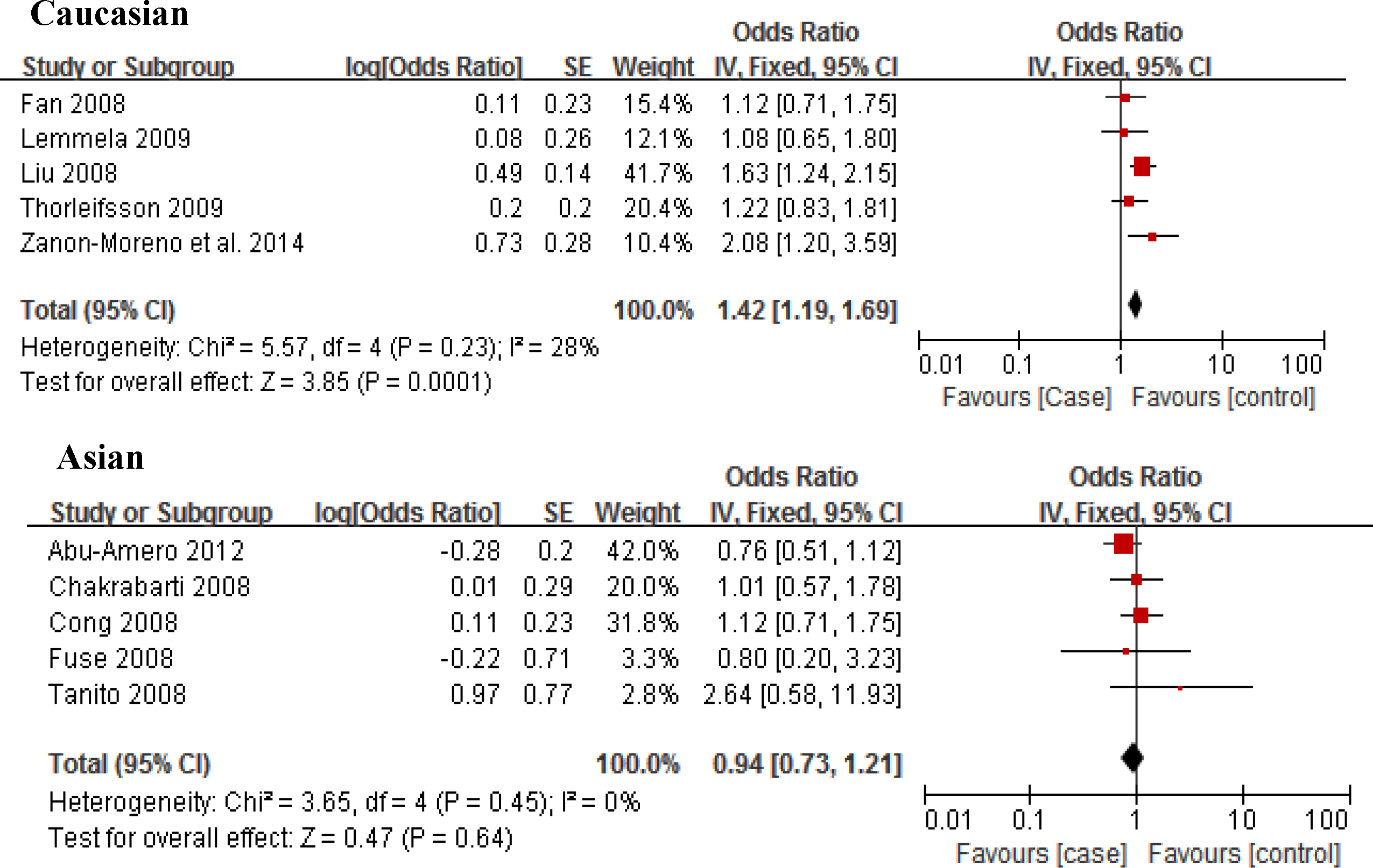 rs2165241 in the Caucasian and Asian populations; the horizontal lines correspond to the study-specific OR and 95% CI, respectively.