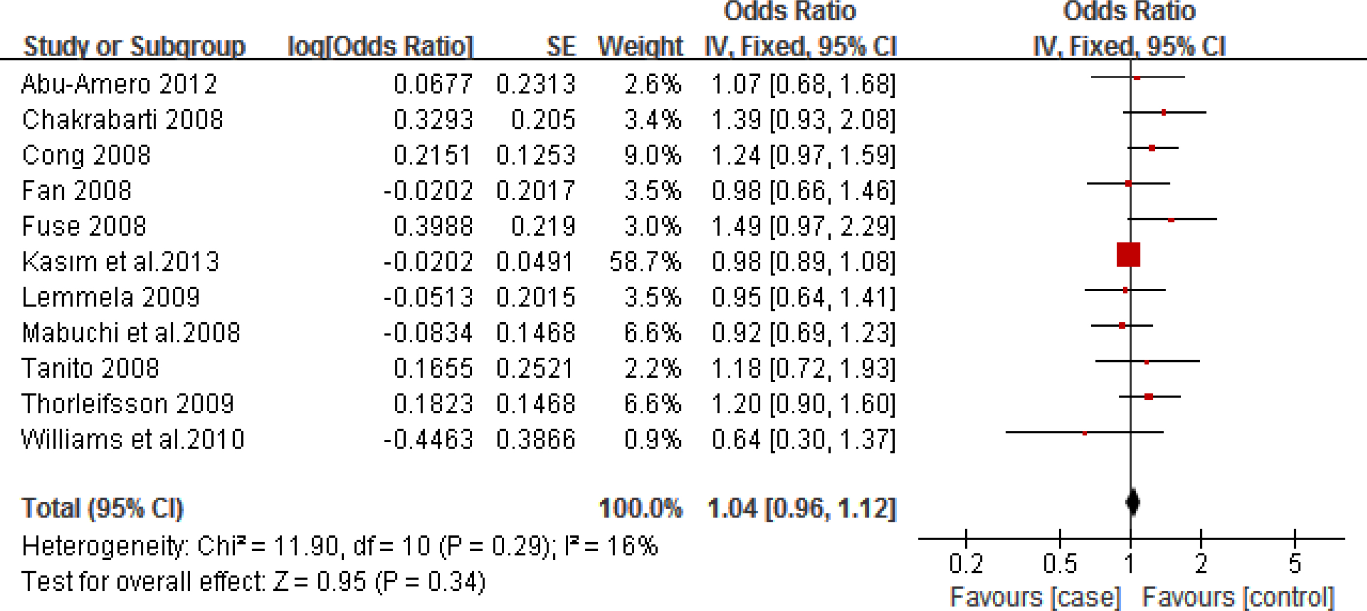 squares reflects the study-specific weight. The diamond represents the pooled results of the OR and 95%CI. In this analysis,