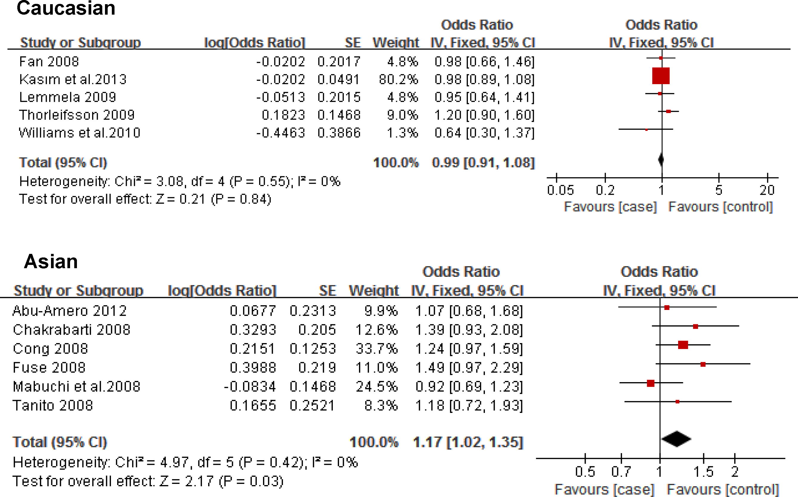 rs1048661 in the Caucasian and Asian populations; the horizontal lines correspond to the study-specific OR and 95% CI, respectively.