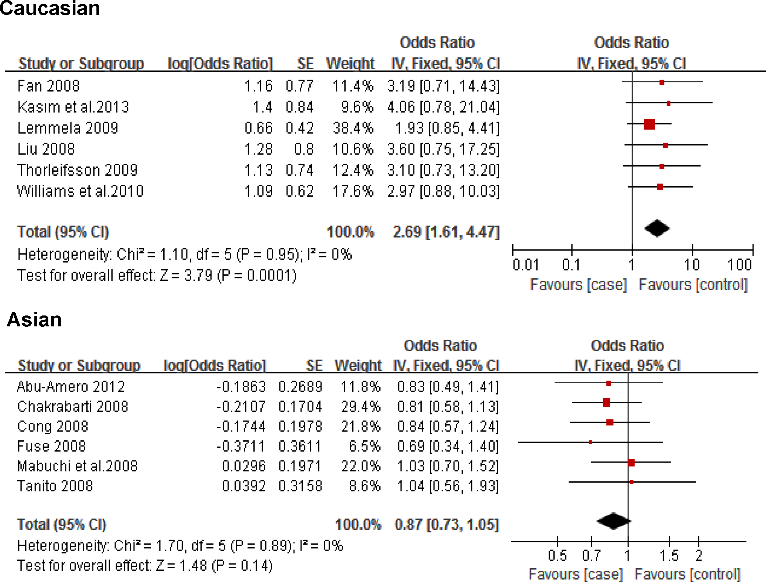 rs3825942 in the Caucasian and Asian populations; the horizontal lines correspond to the study-specific OR and 95% CI, respectively.