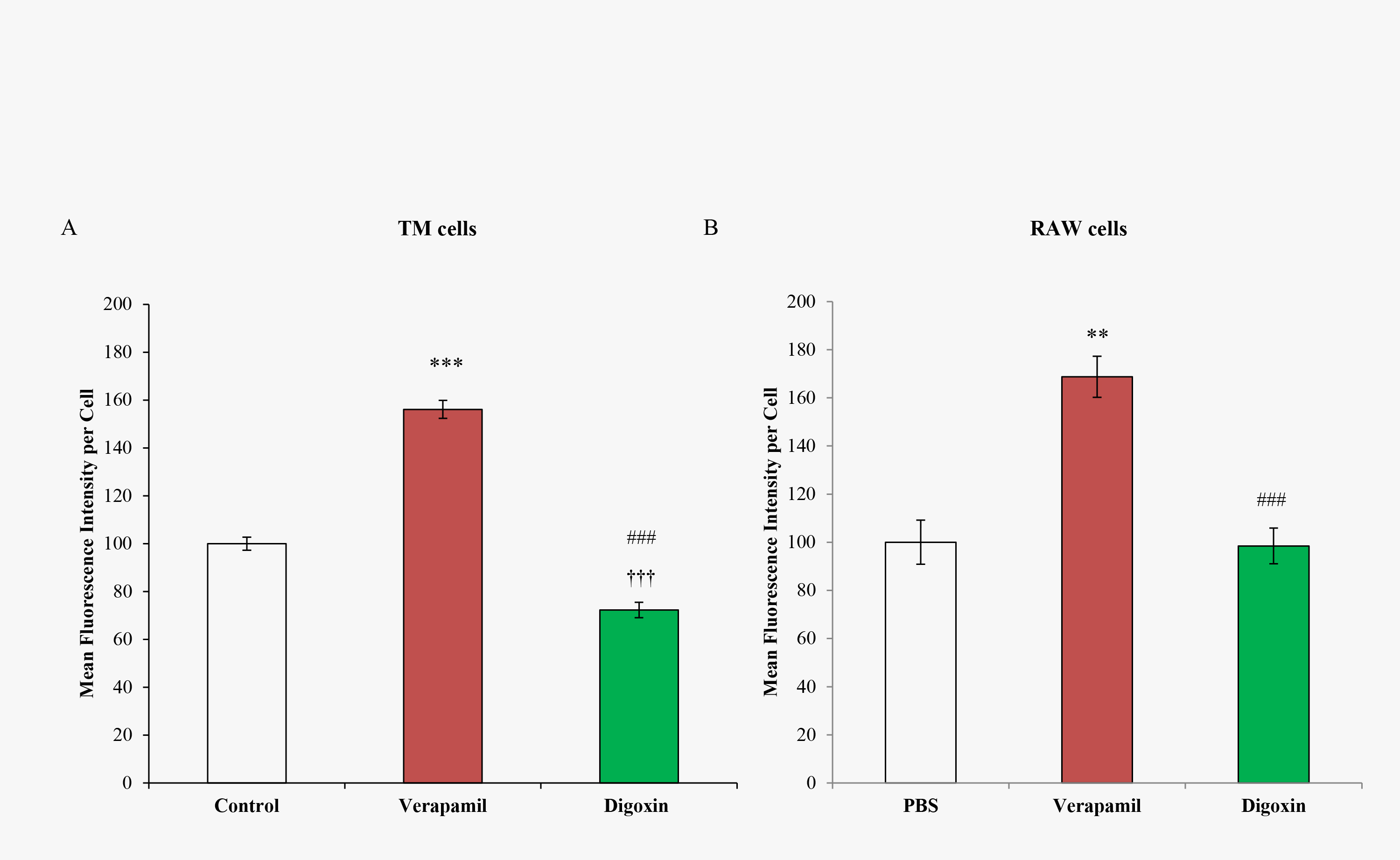Figure 3. Calcein AM assay following verapamil and digoxin treatment in TM and RAW 264.7 macrophage (RAW) cells. (A) Trabecular meshwork (TM) cells and (B) RAW cells were treated with PBS (control), 100 µM verapamil, and 50 µM digoxin. Error bars are presented as ± standard error