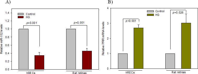 Figure 5. Effect of HG on the expressions of miR-152 and PRR in hRECs and rat retinal tissues. Hyperglycemic cells or retinal tissues