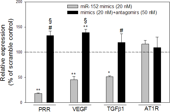 Figure 6. Effect of miR-152 mimics on HG-induced VEGF and TGFβ1 expressions in hRECs. Perindopril-treated cells were transfected with