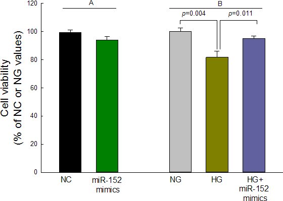 Figure 7. Effect of miR-152 mimics (A) and HG (B) on the viability of hRECs. A: Cells were transfected with 20 nM of scrambled, miR-152 mimics, or 50 nM antagomirs for 24 h. B: Cells were transfected with miRNA mimics then incubated with HG (33 mM) before adding the CellTiter-Blue reagents; HG was