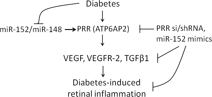 miR-152 is involved in the stimulation of angiogenic molecules and retinal inflammation in the hyperglycemic environment. T’s indicate an inhibitory effect while the arrowheads represent an activation or stimulatory effect.