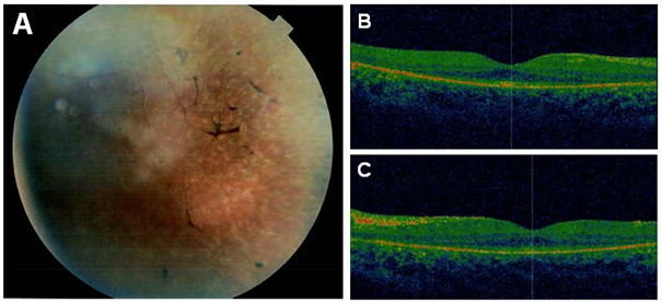 B: Optical coherence tomography (OCT) image of the right eye. C: OCT image of the left eye. OCT imaging showed an overall decrease in retinal thickness with shortening of the photoreceptor