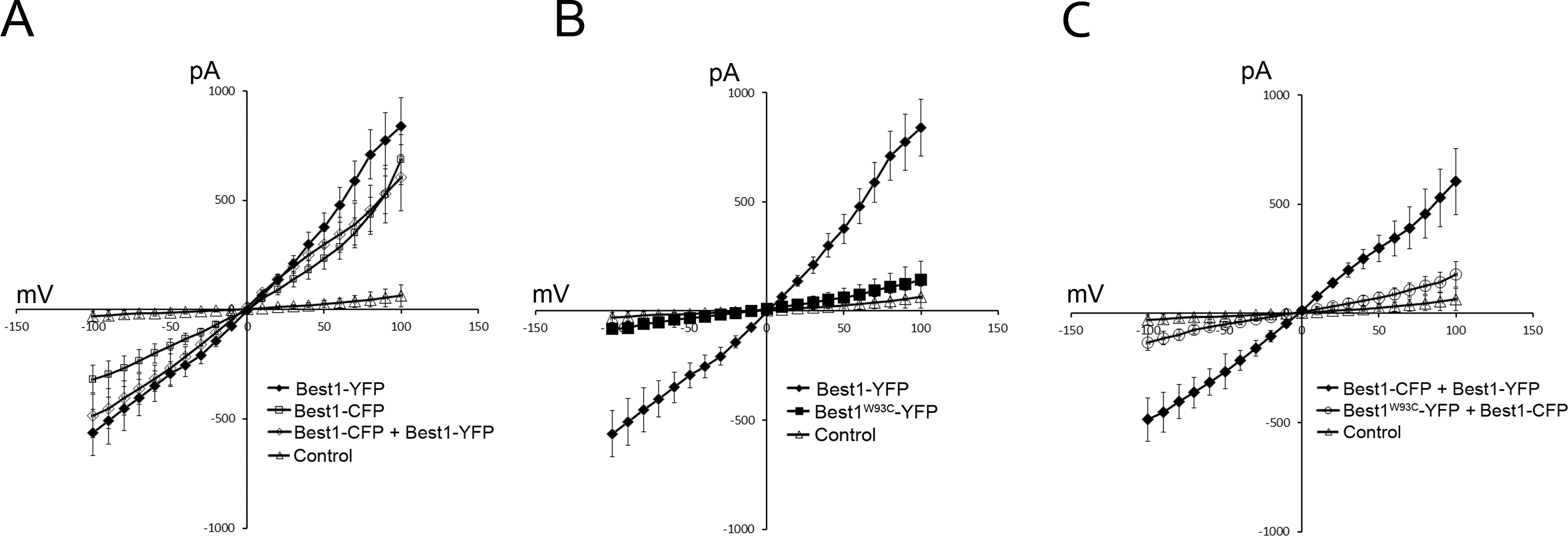 recorded from the same plate. B: In contrast, Best1W93C exhibited a significant loss of anion channel activity compared to Best1-YFP (B), and dominantly inhibited the anion channel activity of wild-type Best1-YFP when co-expressed (C).