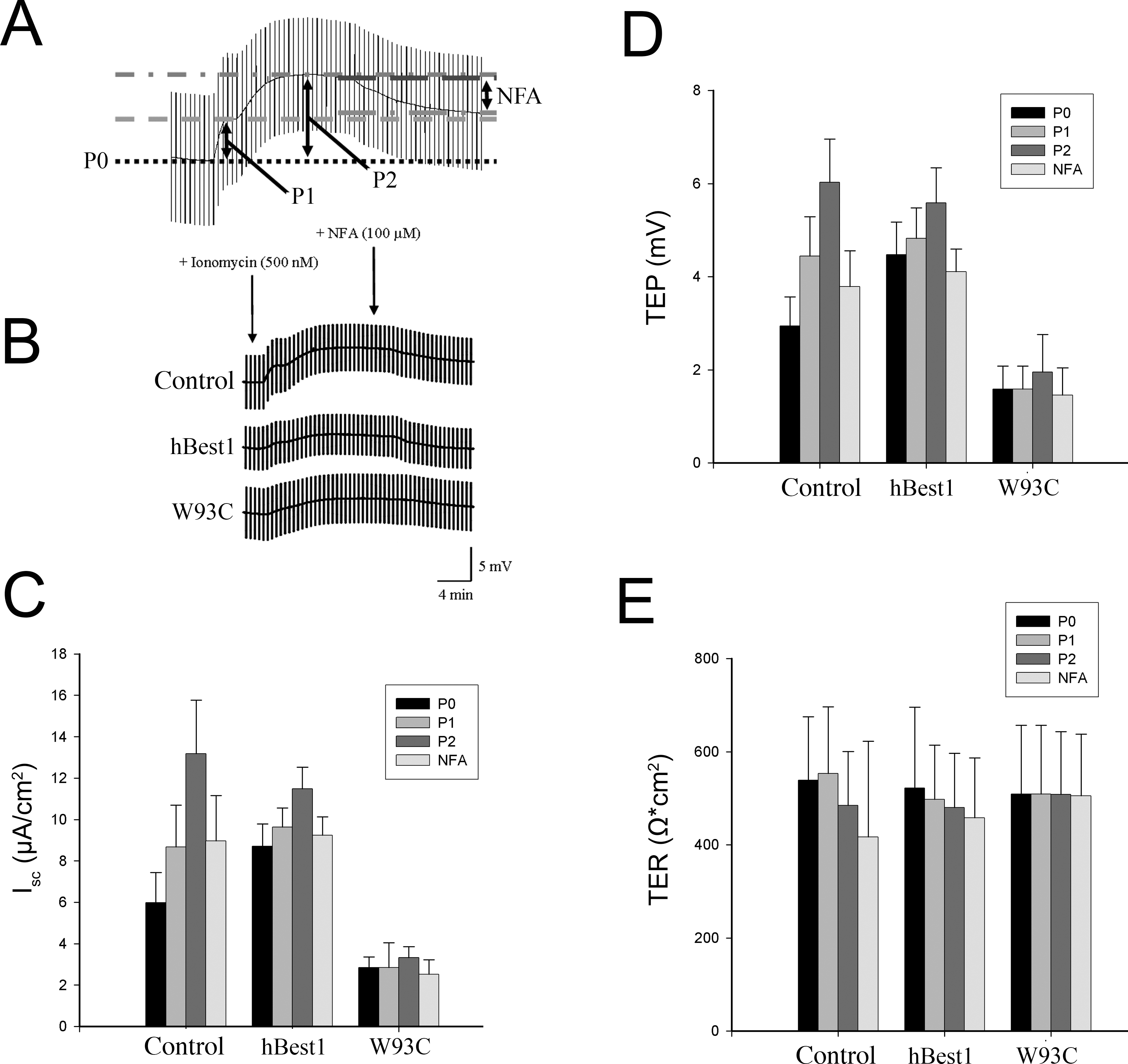 overexpressing hBest1W93C. However, at P1, P2, and NFA, Isc was not significantly different between controls and monolayers overexpressing hBest1. Neither ionomycin nor NFA had a significant