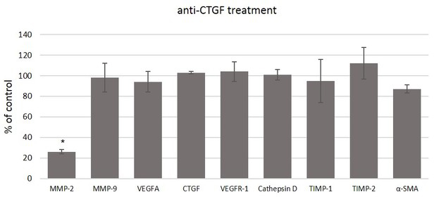 section. mRNA levels were normalized to glyceraldehyde 3-phosphate dehydrogenase (GAPDH) and presented as folds of the control values. Anti-CTGF decreased gene expression of matrix metalloproteinase-2 (MMP-2)