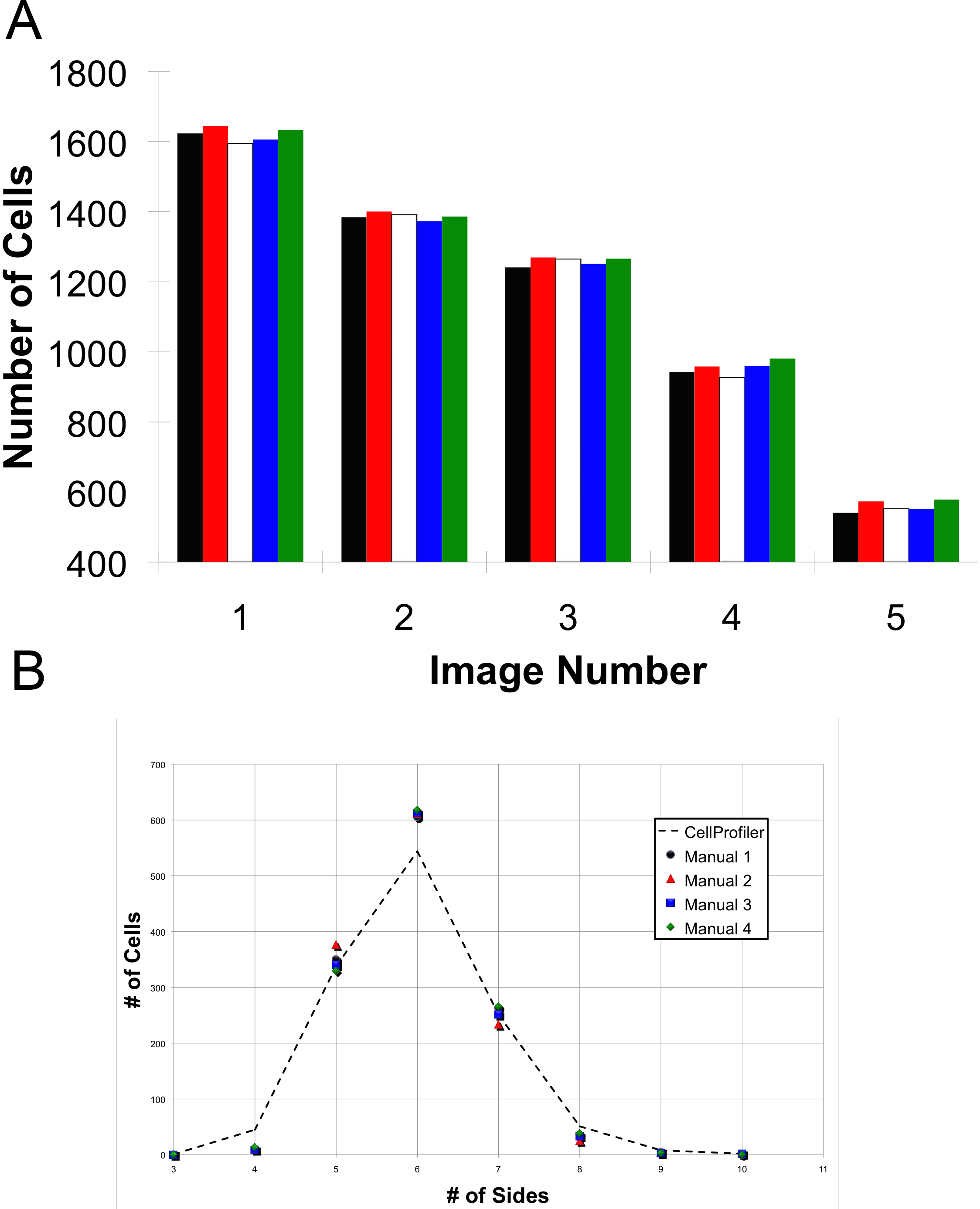 CellProfiler’s accuracy on the counting of cells with a given number of sides, displayed in a scatter plot compared to four manual counts.