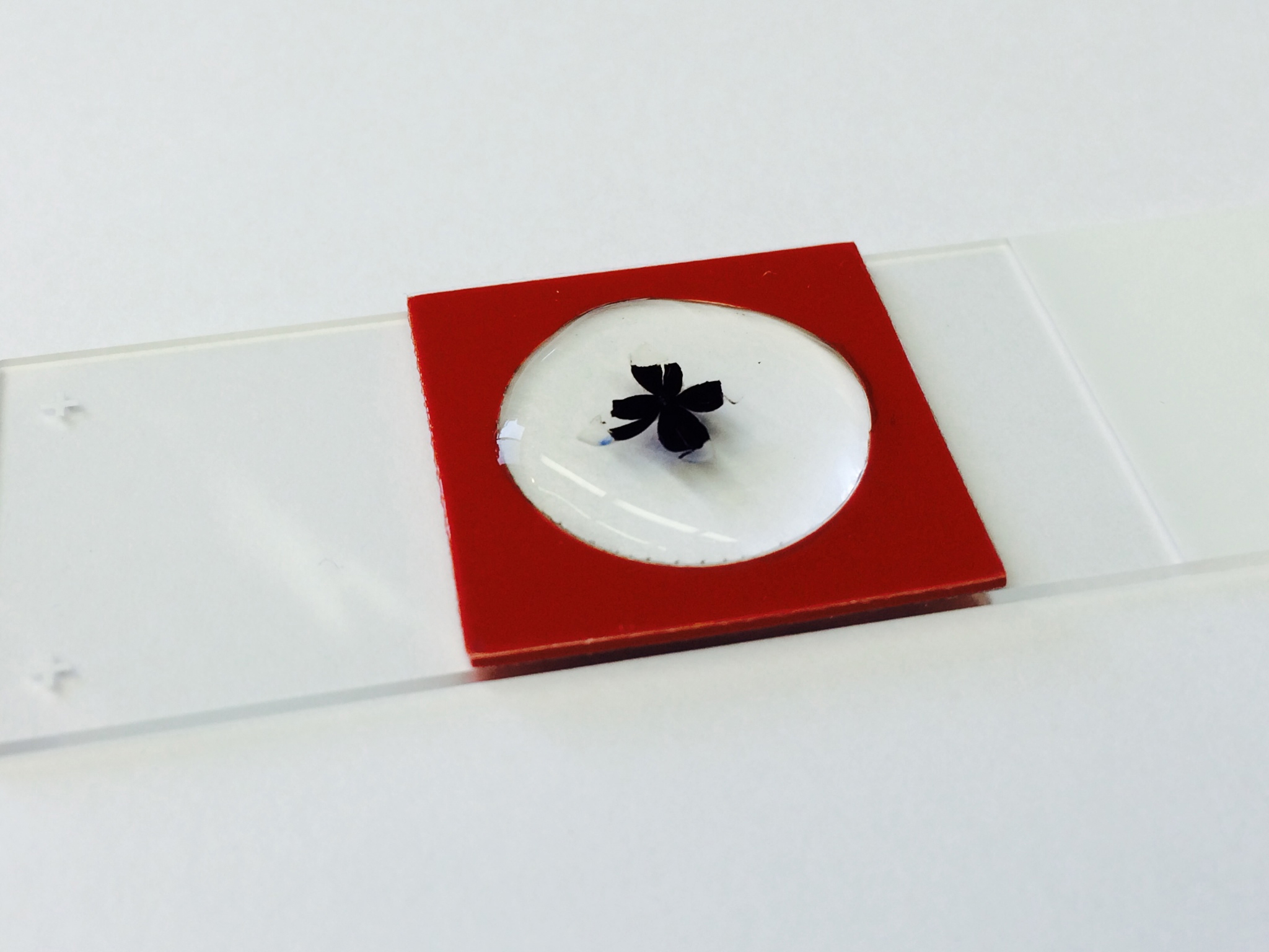 Completed flatmount immersed in antibody. All antibody staining is performed directly on a microscope slide. A silicone gasket creates a 300 µl well surrounding the flatmounted RPE.