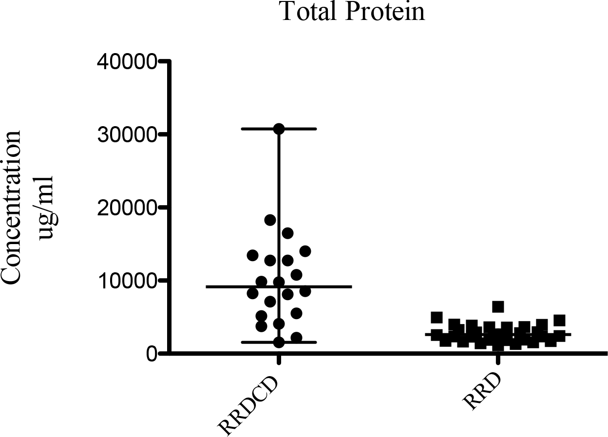 Figure 1. Scatter plots of total protein in the vitreous of patients with RRDCD and RRD. The bicinchoninic acid protein assay was used