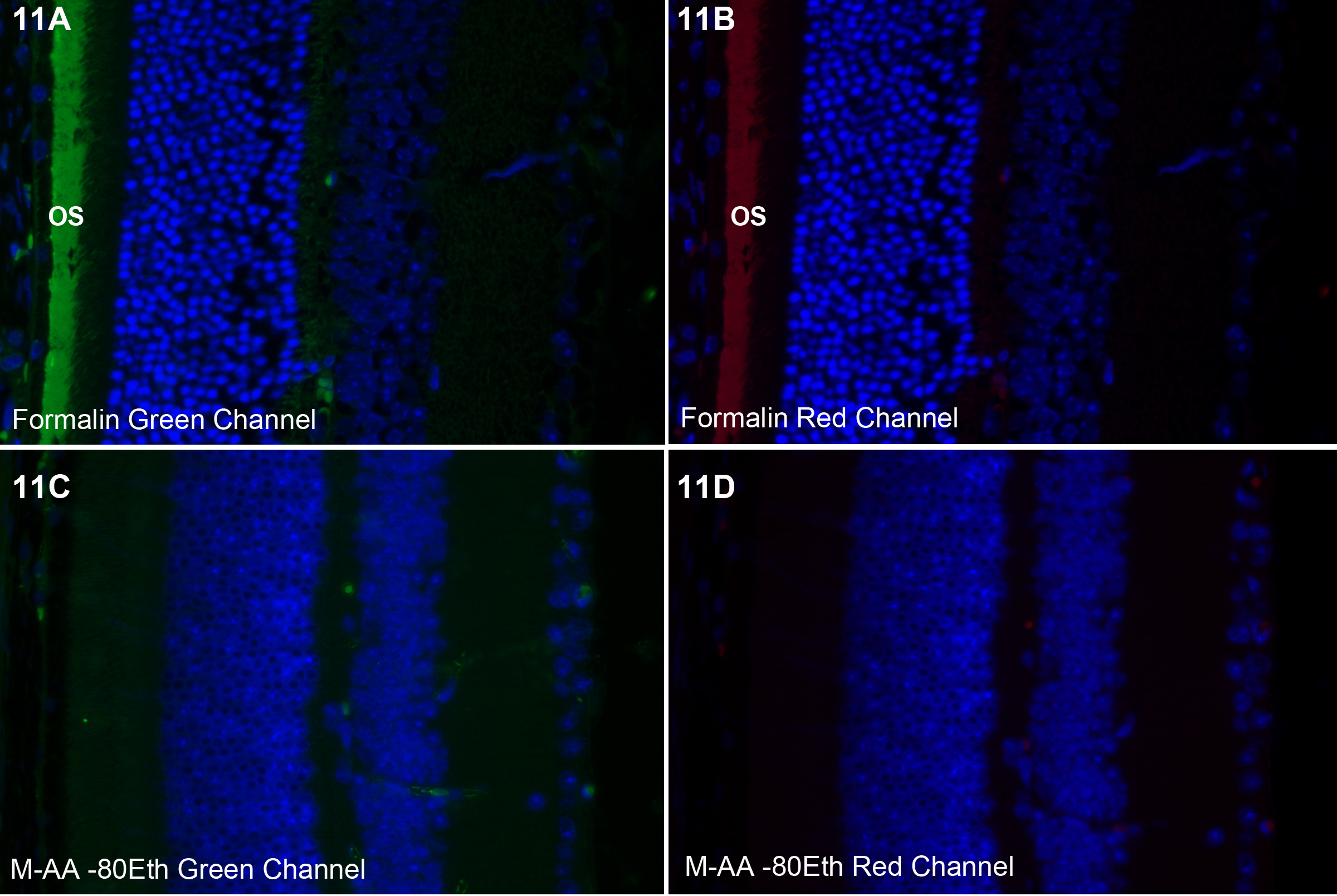 Figure 11. Photoreceptor outer segment autofluorescence. Formalin-fixed tissue exhibits a broad autofluorescence in both the green (A) and red (B) channels in the outer segments (os). Preservation by freeze substitution eliminated this autofluorescence (C-D).