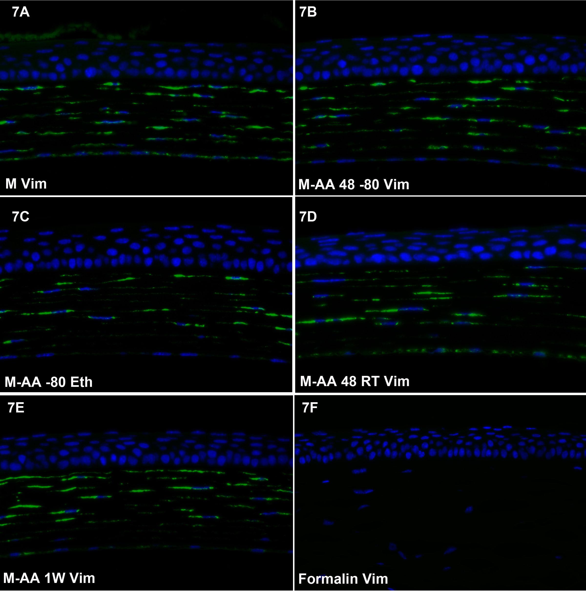 Figure 7. Corneal labeling with anti-vimentin antibody. Freeze substitution variants (A-E) all yielded greater immunoreactivity than the formalin-fixed tissue. There appears to be slightly better retention of reactivity