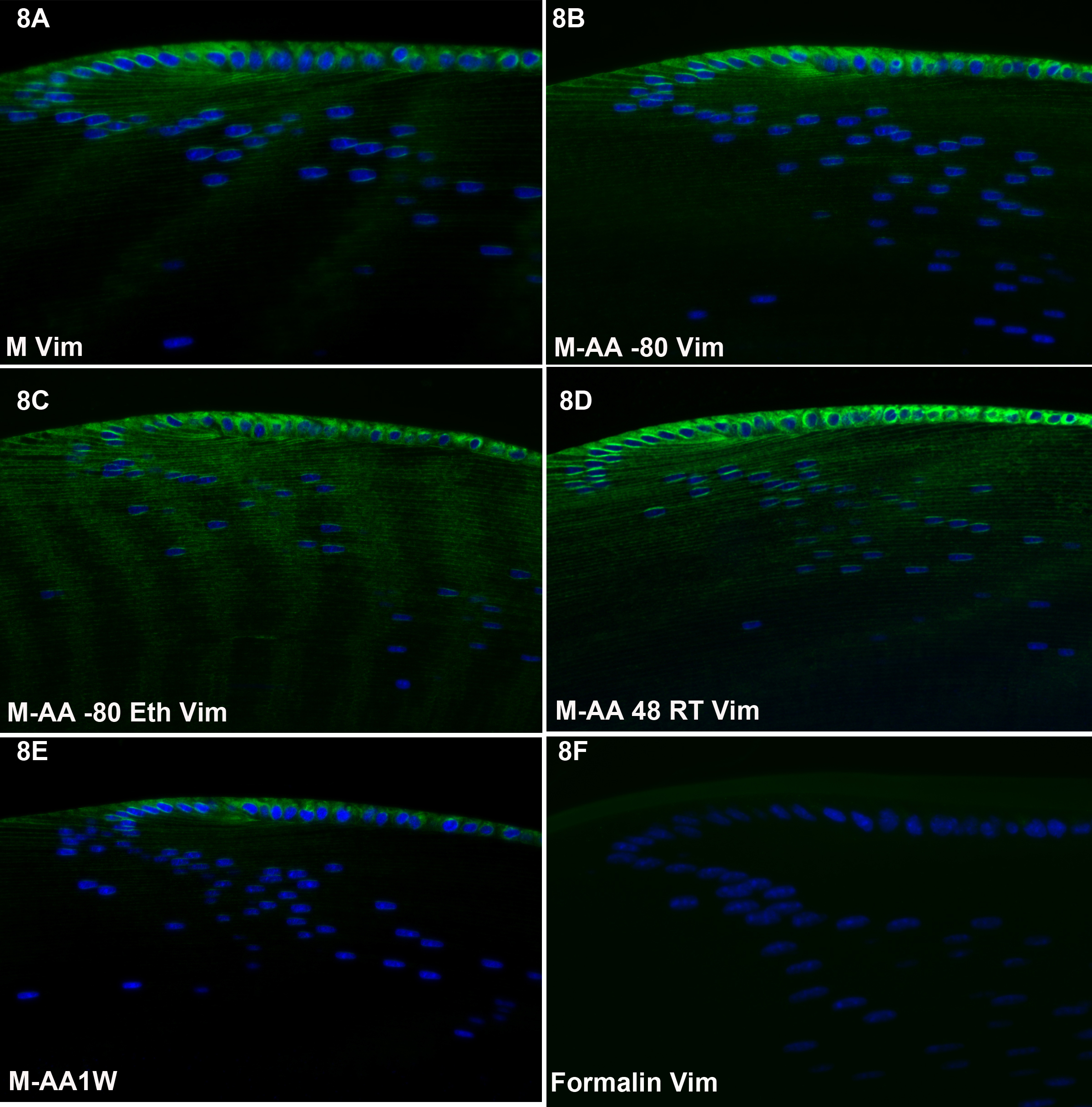Figure 7, the M-AA 48 RT appears strongest. The M-AA 1W appears to be the least reactive of the freeze-substituted tissues.