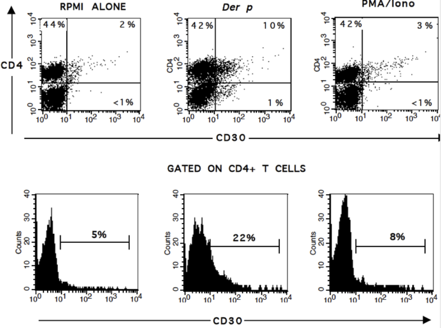 Figure 1. Frequency of CD4+CD30+ T cells after stimulation. A: Representative dot plots of peripheral blood mononuclear cells (PBMCs) stimulated with Dermatophagoides pteronyssinus (Der p) or Phorbol myristate acetate (PMA) in patients with vernal keratoconjunctivitis (VKC). B: Comparative histograms of CD30 frequency on CD4+ gated cells. Dot plots and histograms are representative from 17 patients