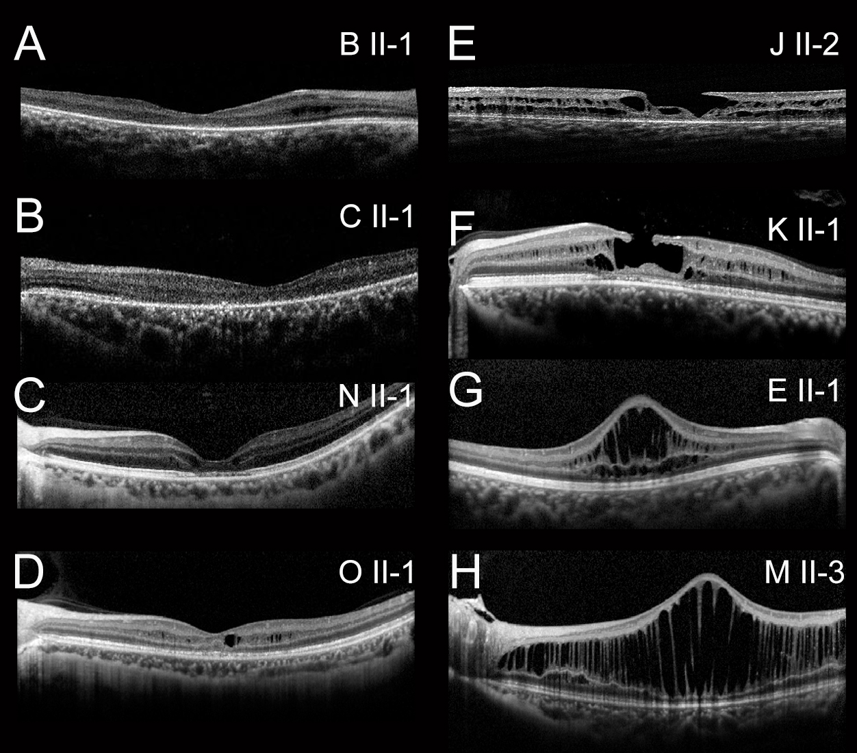 Figure 4. SD-OCT in patients with X-linked retinoschisis. A: Patient B,II-1 (18 years) had lamellar schisis. B: Patient C,II-1 (23 years) had photoreceptor and RPE atrophy in the fovea. C: Patient N,II-1 (51 years) had parafoveal schisis and foveal atrophy. D: Patient O,II-1 (30 years) had foveolamellar schisis. E: Patient J,II-2 (5 years) had foveolamellar schisis and lamellar hole. F: Patient K,II-1 (22 years; OS) had foveolamellar schisis and lamellar hole. G: Patient E,II-1 (6 years) had foveal schisis and increased thickness in the fovea. H: Patient M,II-3 (4 years) had foveolamellar schisis and increased thickness in the macula area.