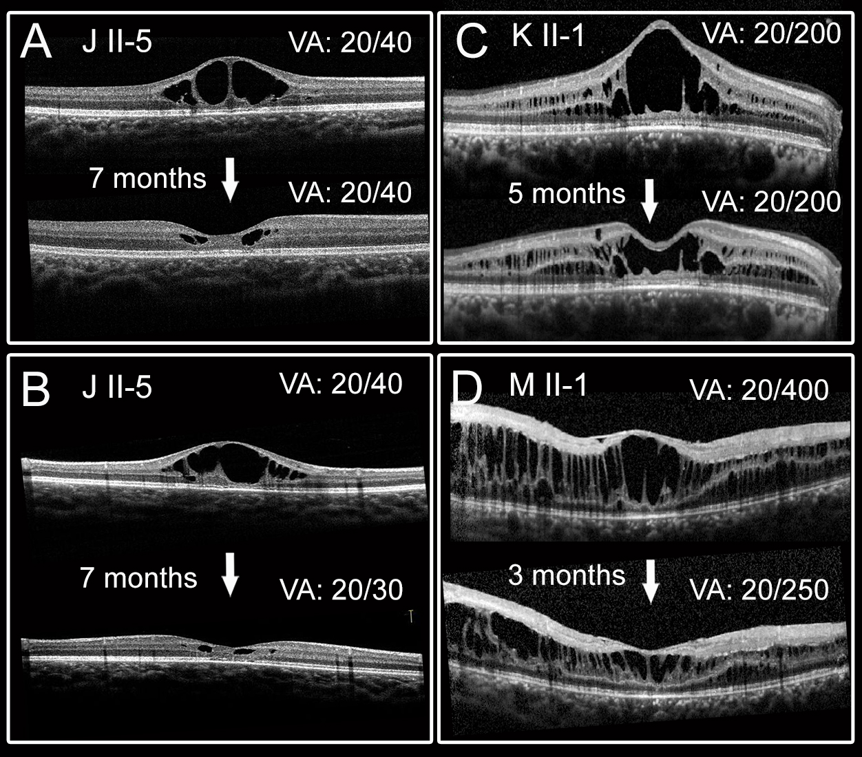 A, B: Patient J,II-5 (10 years) showed partial resolution of foveal cysts after topical dorzolamide treatment for 7 months, A: