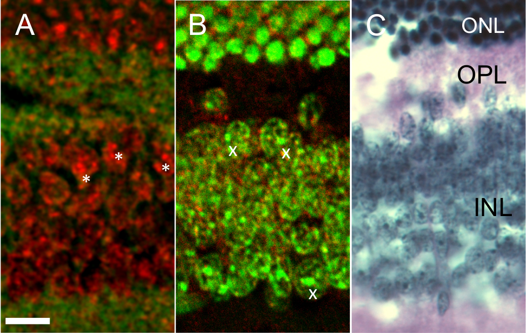 Figure 4. Comparison of the inner and outer nuclear layers of the retina. A: Without a fluorescent nuclear dye (ethidium bromide homodimer; EthD-1) counterstain. B: With nuclear fluorescent dye. Panels A and B show the inner nuclear layer imaged with third harmonic generation (THG) and two-photon autofluorescence (TPAF). The EthD-1