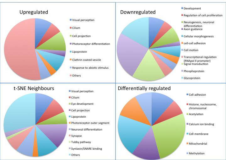 Figure 3. Functional breakdown of upregulated, downregulated, differentially regulated, and “neighbors” data sets. The differentially