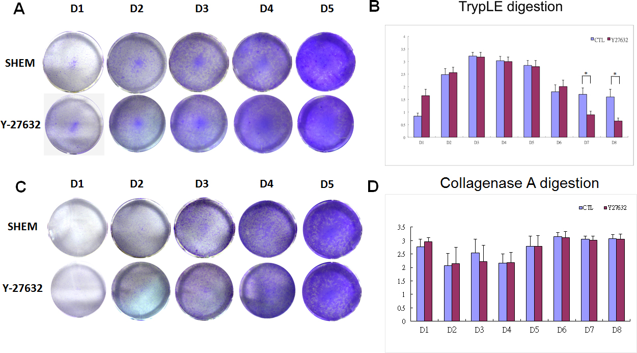 between the groups prepared with TrypLE from day 1 to day 6. However, Y-27632 significantly decreased the BrdU incorporation